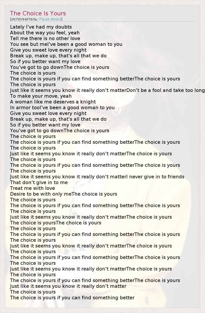 Lately I've had my doubts About the way you feel, yeah Tell me there is no other love You see but meI've been a good woman to you Give you sweet love every night Break up, make up, that's all that we do So if you better want my love You've got to go downThe choice is yours The choice is yours The choice is yours if you can find something betterThe choice is yours The choice is yours Just like it seems you know it really don't matterDon't be a fool and take too long To make your move, yeah A woman like me deserves a knight In armor tooI've been a good woman to you Give you sweet love every night Break up, make up, that's all that we do So if you better want my love You've got to go downThe choice is yours The choice is yours The choice is yours if you can find something betterThe choice is yours The choice is yours Just like it seems you know it really don't matterThe choice is yours The choice is yours The choice is yours if you can find something betterThe choice is yours The choice is yours Just like it seems you know it really don't matterI never give in to friends That don't give in to me Treat me with love Desire to be with only meThe choice is yours The choice is yours The choice is yours if you can find something betterThe choice is yours The choice is yours Just like it seems you know it really don't matterThe choice is yours The choice is yoursThe choice is yours The choice is yours The choice is yours if you can find something betterThe choice is yours The choice is yours Just like it seems you know it really don't matterThe choice is yours The choice is yours The choice is yours if you can find something betterThe choice is yours The choice is yours Just like it seems you know it really don't matterThe choice is yours The choice is yours The choice is yours if you can find something betterThe choice is yours Just like it seems you know it really don't matter The choice is yours The choice is yours if you can find something better