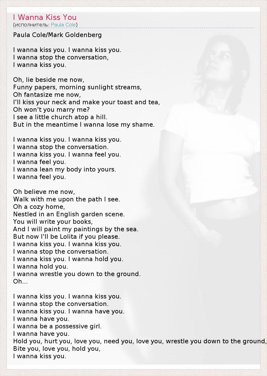 Paula Cole/Mark Goldenberg I wanna kiss you. I wanna kiss you. I wanna stop the conversation, I wanna kiss you. Oh, lie beside me now, Funny papers, morning sunlight streams, Oh fantasize me now, I'll kiss your neck and make your toast and tea, Oh won't you marry me? I see a little church atop a hill. But in the meantime I wanna lose my shame. I wanna kiss you. I wanna kiss you. I wanna stop the conversation. I wanna kiss you. I wanna feel you. I wanna feel you. I wanna lean my body into yours. I wanna feel you. Oh believe me now, Walk with me upon the path I see. Oh a cozy home, Nestled in an English garden scene. You will write your books, And I will paint my paintings by the sea. But now I'll be Lolita if you please. I wanna kiss you. I wanna kiss you. I wanna stop the conversation. I wanna kiss you. I wanna hold you. I wanna hold you. I wanna wrestle you down to the ground. Oh... I wanna kiss you. I wanna kiss you. I wanna stop the conversation. I wanna kiss you. I wanna have you. I wanna have you. I wanna be a possessive girl. I wanna have you. Hold you, hurt you, love you, need you, love you, wrestle you down to the ground, Bite you, love you, hold you, I wanna kiss you.