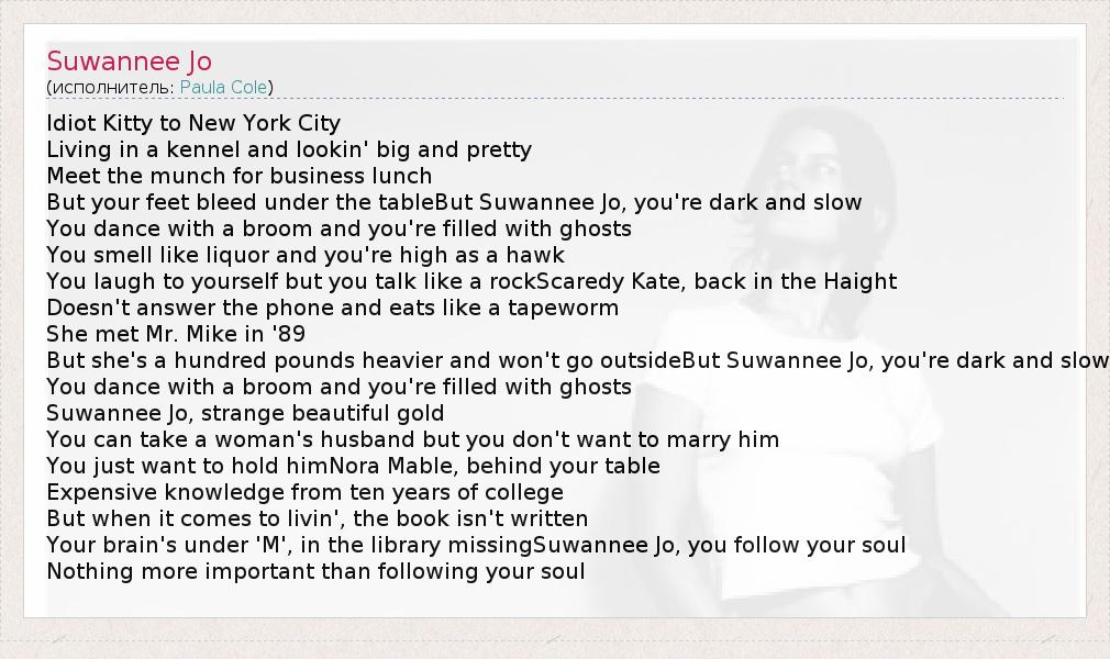Это интересно:Паула Коул – удивительное явление в музыке поздних 90-х. Пола выросла в семье художницы и музыканта-любителя. Она родилась 5 апреля 1968 года в городе Рокпорт штата Массачусетс (США). В ее доме ежемгновенно звучала музыка, хотя около отродясь не играло радио или магнитофон. Музыкальным фоном были импровизации на разных инструментах в самых разных ситуациях, будь то посиделки на кухне или... продолжение