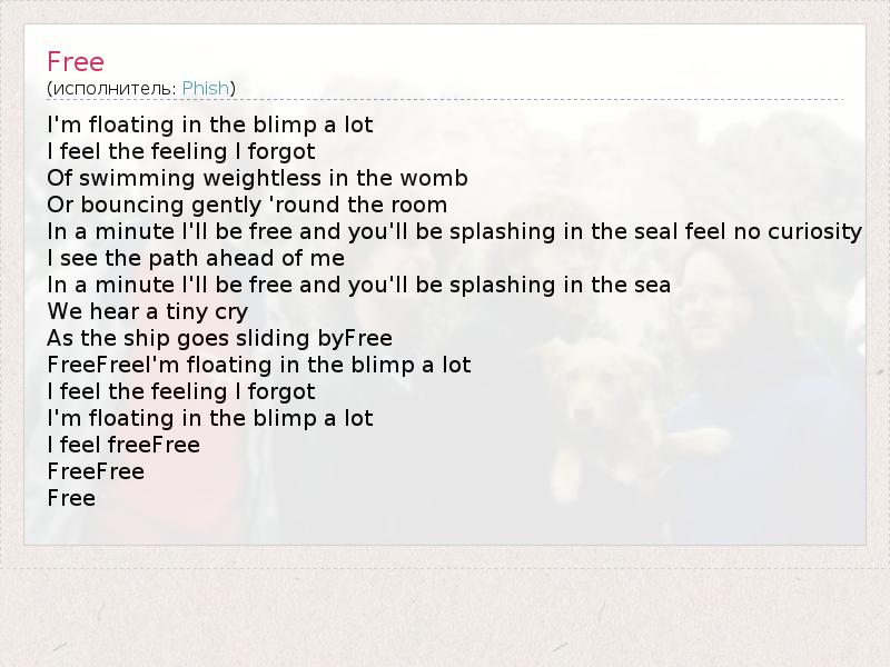 I'm floating in the blimp a lot I feel the feeling I forgot Of swimming weightless in the womb Or bouncing gently 'round the room In a minute I'll be free and you'll be splashing in the seaI feel no curiosity I see the path ahead of me In a minute I'll be free and you'll be splashing in the sea We hear a tiny cry As the ship goes sliding byFree FreeFreeI'm floating in the blimp a lot I feel the feeling I forgot I'm floating in the blimp a lot I feel freeFree FreeFree Free