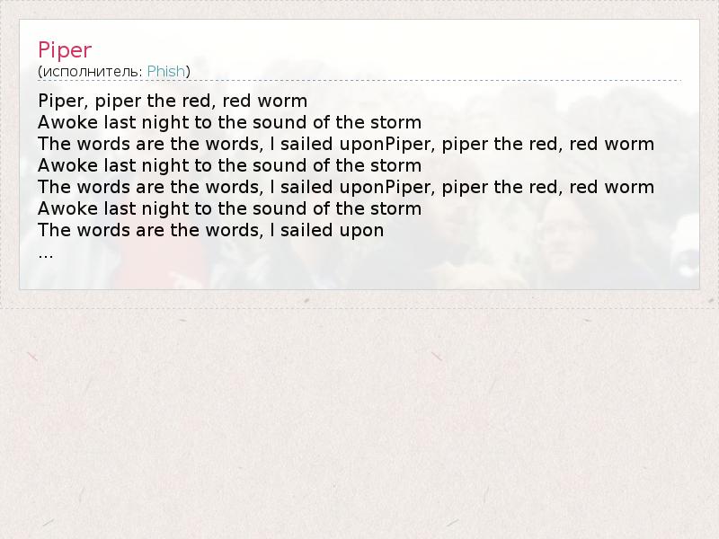 Piper, piper the red, red worm Awoke last night to the sound of the storm The words are the words, I sailed uponPiper, piper the red, red worm Awoke last night to the sound of the storm The words are the words, I sailed uponPiper, piper the red, red worm Awoke last night to the sound of the storm The words are the words, I sailed upon ...