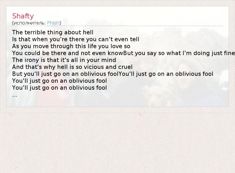 Это интересно:Phish — американская рок-группа, примечательная своими джем-сейшнами, импровизациями и постмодернистским смешением жанров. Phish была образована в 1983 году в университете Вермонта. Четыре ее участника выступали вместе 21 год, пока не распались в августе 2004 года. Их музыка содержала в себе элементы широкoго спектра жанров, и каждый их концерт был оригинальным в плане исполнения песен, порядка... продолжение