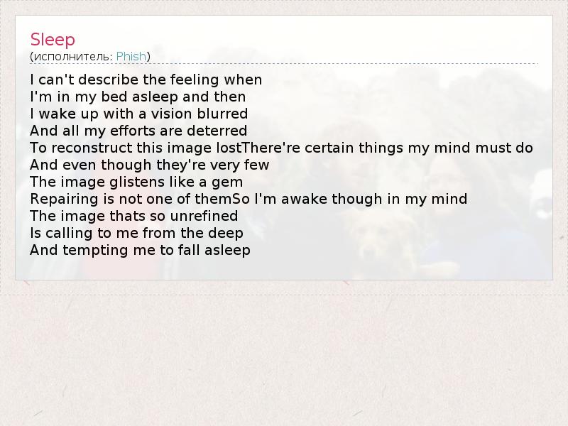 Это интересно:Phish — американская рок-группа, примечательная своими джем-сейшнами, импровизациями и постмодернистским смешением жанров. Phish была образована в 1983 году в университете Вермонта. Четыре ее участника выступали вместе 21 год, пока не распались в августе 2004 года. Их музыка содержала в себе элементы широкoго спектра жанров, и каждый их концерт был оригинальным в плане исполнения песен, порядка... продолжение