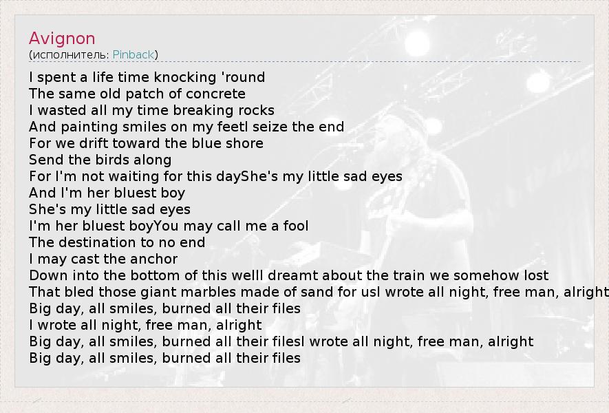 Это интересно:Pinback - indie rock группа из San Diego, CA, в данный момент подписаная на лейбле Touch and Go Records. Группа была создана в 1998 двумя певцами и мульти-инструменталистами: Армистэдом Бурвеллом Смитом Четвертым (или просто - Зак Смит) и Робом Кроу.За 10 лет существования группа записала четыре полноформатных альбома, последний из которых, The Autumn Of Seraphs, вышел... продолжение