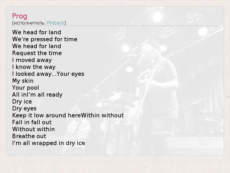 Это интересно:Pinback - indie rock группа из San Diego, CA, в данный момент подписаная на лейбле Touch and Go Records. Группа была создана в 1998 двумя певцами и мульти-инструменталистами: Армистэдом Бурвеллом Смитом Четвертым (или просто - Зак Смит) и Робом Кроу.За 10 лет существования группа записала четыре полноформатных альбома, последний из которых, The Autumn Of Seraphs, вышел... продолжение