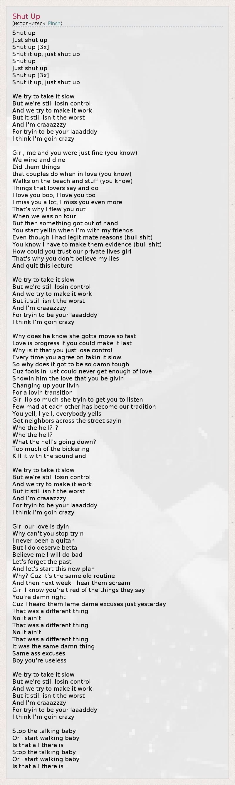 Заткнись, Просто заткнись. Заткнись [3 раза] Заткнись, просто заткнись. Заткнись, Просто заткнись. Заткнись [3 раза] Заткнись, просто заткнись. Мы пытаемся не торопиться, Но всё равно теряем контроль над собой. Мы хотим сделать так, чтобы всё сработало, Но это ещё не самое худшее. И я схожу с ума, Стремясь стать твоей девушкой. Думаю, я схожу с ума. Детка, нам с тобой вместе было просто здорово (ну, ты же знаешь), Мы пили вино и если всякие яства, Мы делали то, Чем занимаются влюблённые пары (ну, ты же знаешь), Мы гуляли по пляжу, и всё такое (ну, ты же знаешь), Мы говорили то, что говорят влюблённые. Я люблю тебя, я тоже тебя люблю. Я сильно скучаю по тебе, я скучаю по тебе даже больше, Поэтому я полетел С тобой в турне. Но потом что-то пошло не так. Ты кричала на меня, если я проводил время с друзьями. Хотя у меня и были законные причины (дер*мо), Мне приходилось постоянно оправдываться (дер*мо). Как ты могла возлагать надежды на нашу совместную личную жизнь, детка? Поэтому ты не поверила моей лжи И не стала меня слушать. Мы пытаемся не торопиться, Но всё равно теряем контроль над собой. Мы хотим сделать так, чтобы всё сработало, Но это ещё не самое худшее. И я схожу с ума, Стремясь стать твоей девушкой. Думаю, я схожу с ума. Откуда он знает, что ей нужно так быстро развиваться. Любовь только движется вперёд, если это длительные отношения. Почему ты теряешь самообладание? Каждый раз ты соглашаешься с тем, что тебе не нужно торопиться. Так почему же для тебя это должно быть так трудно? Ведь дуракам в их похоти никогда не будет достаточно любви. Демонстрируя ему любовь, которую ты будешь ему дарить, Изменяя свои жизненные устои Ради любви, Детка так много треплется, она хочет заставить тебя слушать. То, что мы немного сумасшедшие в отношениях друг с другом, - наша традиция. Ты кричишь, я кричу, все кричат. Даже соседи напротив спрашивают: Кто это, чёрт возьми? Кто это, чёрт возьми? Что, чёрт возьми, происходит? Слишком много пустой болтовни. Мы прекращаем это в одно мгновение И пытаемся не торопиться, Но всё равно теряем контроль над собой. Мы хотим сделать так, чтобы всё сработало, Но это ещё не самое худшее. И я схожу с ума, Стремясь стать твоей девушкой. Думаю, я схожу с ума. Детка, наша любовь умирает. Перестань пытаться всё возвратить. Я никогда не сдавался легко, Но я заслуживаю лучшего. Поверь мне, я буду хорошим. Давай забудем о прошлом И начнём всё заново. Почему? Потому что ничего не изменилось. На следующей неделе они опять станут кричать. Детка, я знаю, что ты устала от того, что говорят. Чёрт возьми, но ты прав. Только вчера я выслушивала их дешёвые извинения. Это совсем другое. Вовсе нет. Это совсем другое. Вовсе нет. Это совсем другое. Это было то же самое. Те же тупые извинения. Но малыш, ты ничего не сможешь изменить. Мы пытаемся не торопиться, Но всё равно теряем контроль над собой. Мы хотим сделать так, чтобы всё сработало, Но это ещё не самое худшее. И я схожу с ума, Стремясь стать твоей девушкой. Думаю, я схожу с ума. Хватит разговоров, детка, Или я уйду, детка. Это всё, что ты можешь сказать? Хватит разговоров, детка, Или я уйду, детка. Это всё, что ты можешь сказать?