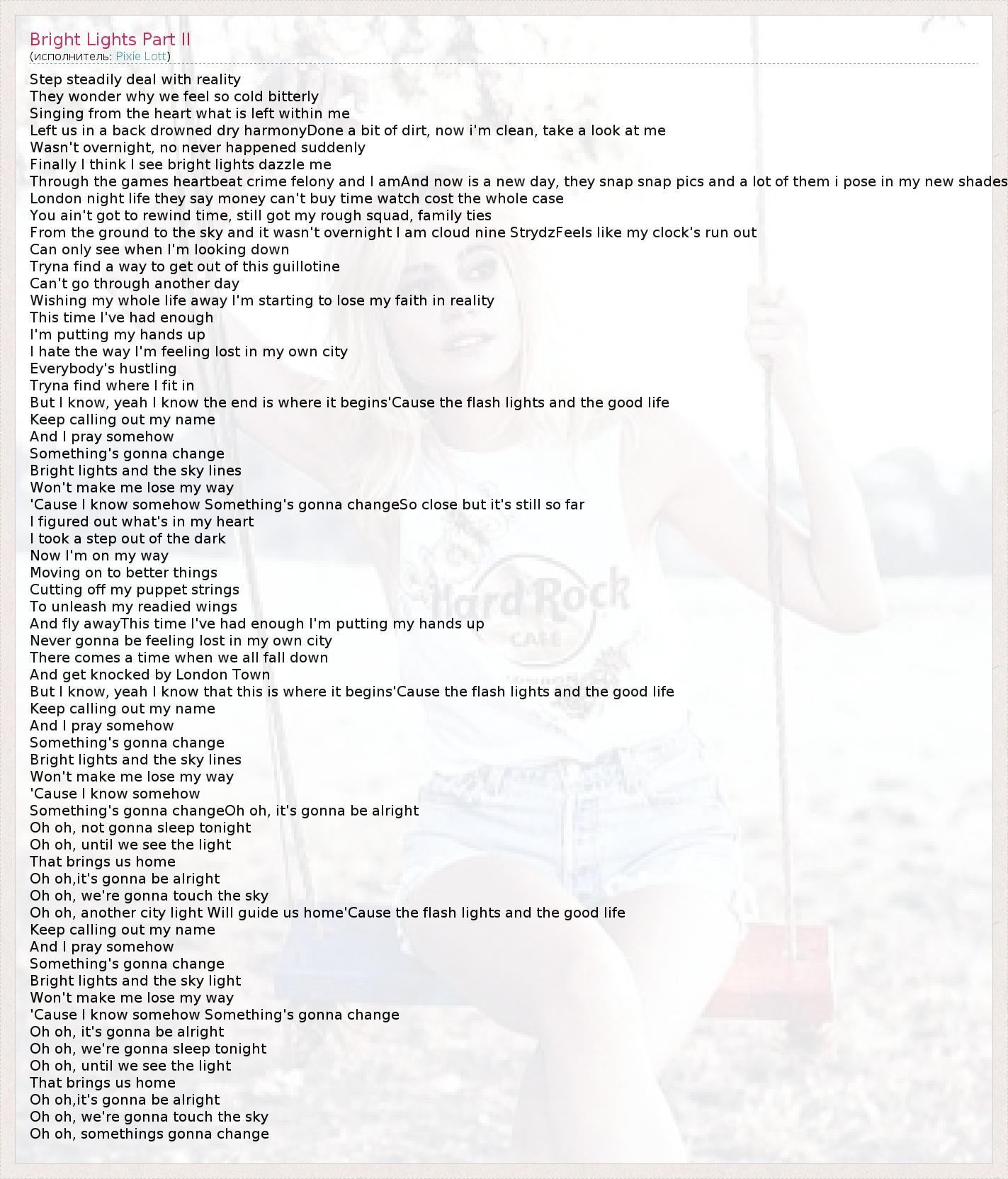 Step steadily deal with reality They wonder why we feel so cold bitterly Singing from the heart what is left within me Left us in a back drowned dry harmonyDone a bit of dirt, now i'm clean, take a look at me Wasn't overnight, no never happened suddenly Finally I think I see bright lights dazzle me Through the games heartbeat crime felony and I amAnd now is a new day, they snap snap pics and a lot of them i pose in my new shades London night life they say money can't buy time watch cost the whole case You ain't got to rewind time, still got my rough squad, family ties From the ground to the sky and it wasn't overnight I am cloud nine StrydzFeels like my clock's run out Can only see when I'm looking down Tryna find a way to get out of this guillotine Can't go through another day Wishing my whole life away I'm starting to lose my faith in reality This time I've had enough I'm putting my hands up I hate the way I'm feeling lost in my own city Everybody's hustling Tryna find where I fit in But I know, yeah I know the end is where it begins'Cause the flash lights and the good life Keep calling out my name And I pray somehow Something's gonna change Bright lights and the sky lines Won't make me lose my way 'Cause I know somehow Something's gonna changeSo close but it's still so far I figured out what's in my heart I took a step out of the dark Now I'm on my way Moving on to better things Cutting off my puppet strings To unleash my readied wings And fly awayThis time I've had enough I'm putting my hands up Never gonna be feeling lost in my own city There comes a time when we all fall down And get knocked by London Town But I know, yeah I know that this is where it begins'Cause the flash lights and the good life Keep calling out my name And I pray somehow Something's gonna change Bright lights and the sky lines Won't make me lose my way 'Cause I know somehow Something's gonna changeOh oh, it's gonna be alright Oh oh, not gonna sleep tonight Oh oh, until we see the light That brings us home Oh oh,it's gonna be alright Oh oh, we're gonna touch the sky Oh oh, another city light Will guide us home'Cause the flash lights and the good life Keep calling out my name And I pray somehow Something's gonna change Bright lights and the sky light Won't make me lose my way 'Cause I know somehow Something's gonna change Oh oh, it's gonna be alright Oh oh, we're gonna sleep tonight Oh oh, until we see the light That brings us home Oh oh,it's gonna be alright Oh oh, we're gonna touch the sky Oh oh, somethings gonna change