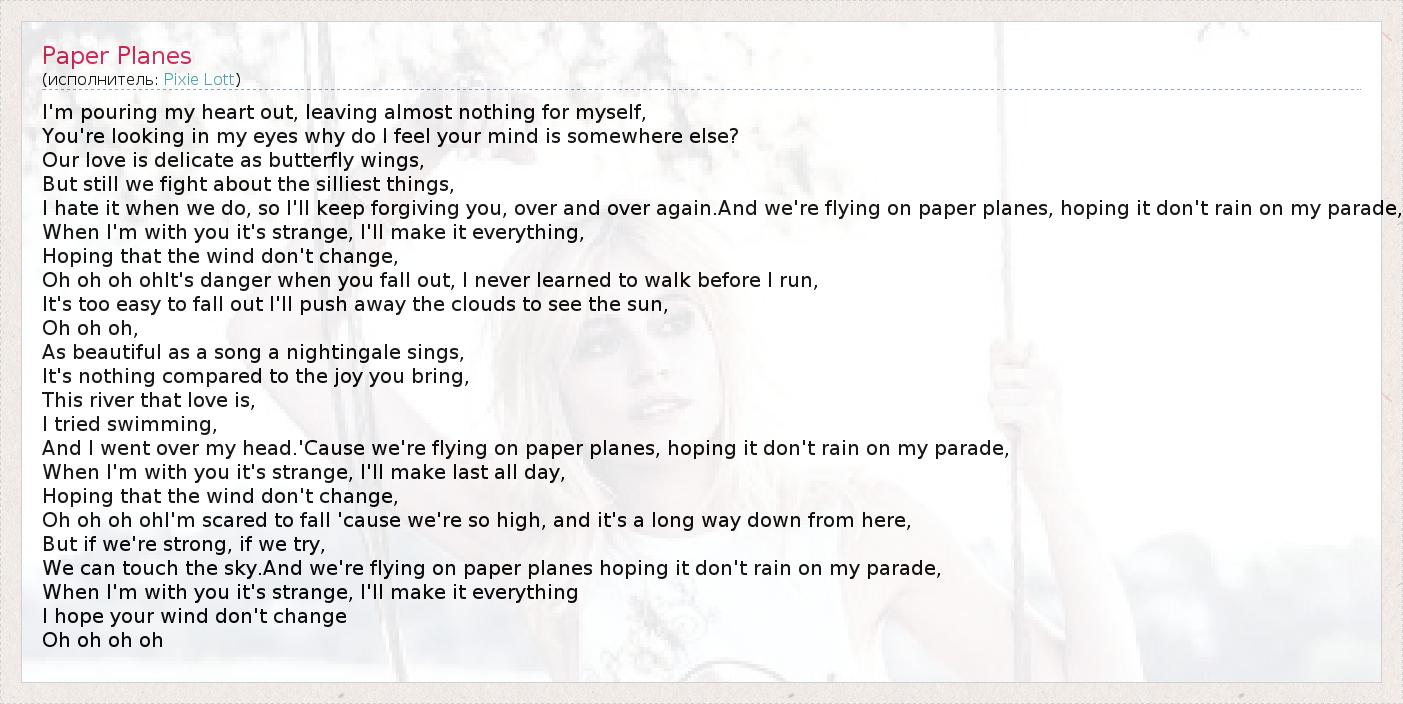 And I went over my head.'Cause we're flying on paper planes, hoping it don't rain on my parade,