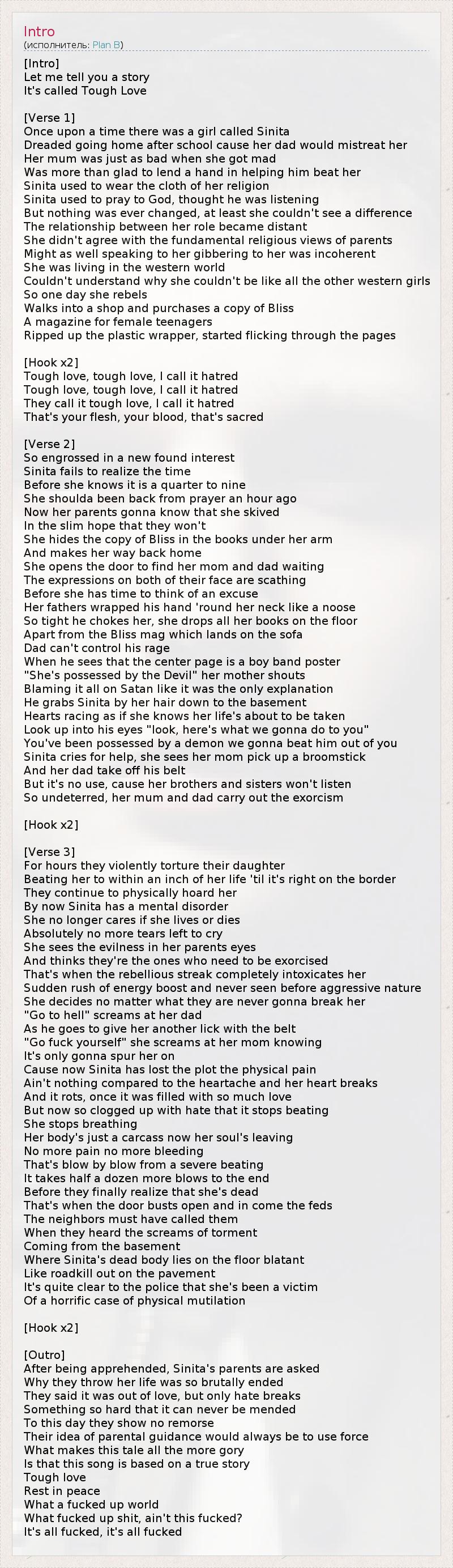 Это интересно:Plan B, настоящее имя которого Бен Дрю – человек неординарный и экстравагантный. Исполнитель с раннего детства был не уверен в себе, отец ушел из семьи, когда ему было 6 лет, в школе его успеваемость тоже «хромала». Подростком Бен самостоятельно освоил игру на гитаре, писал любовную лирику в R&B-стиле, но в восемнадцатилетнем возрасте отдал предпочтение рэпу, так как решил, что в этом жанре... продолжение