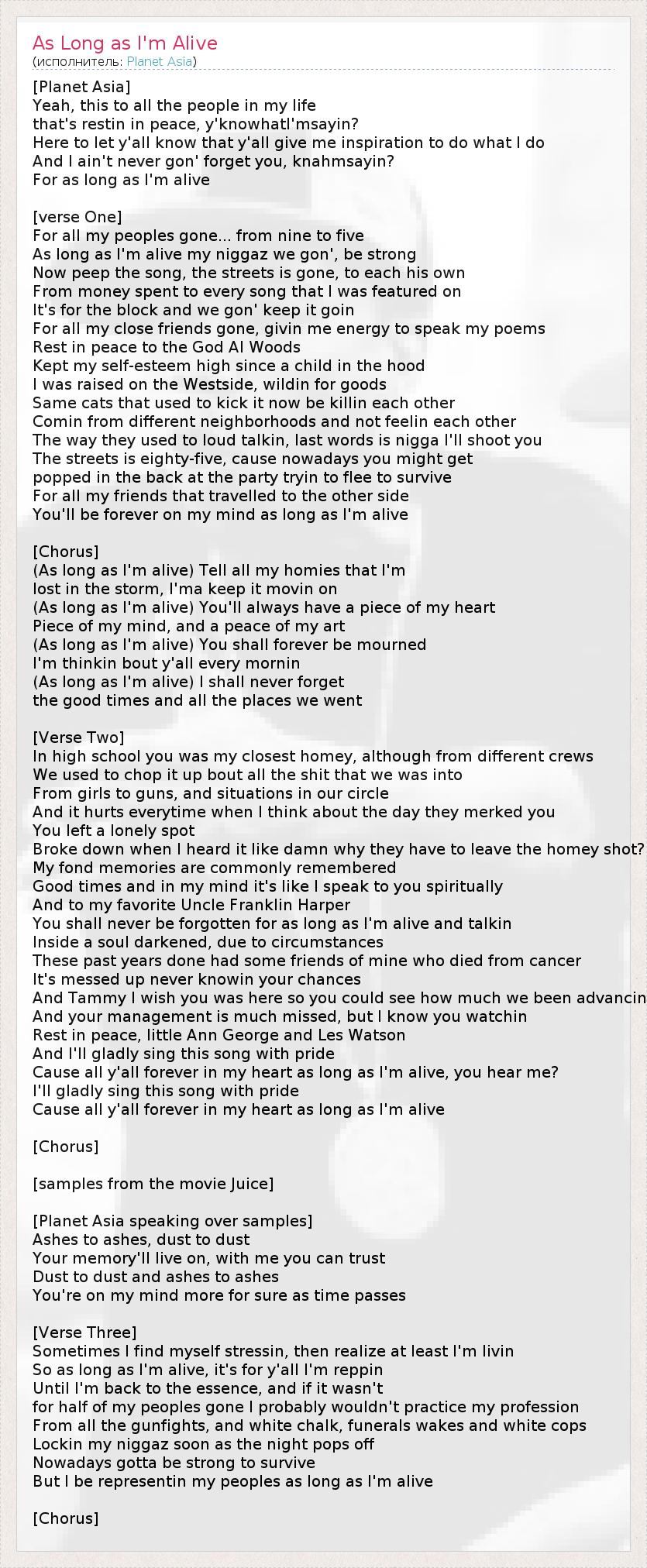 А как ты думаешь, о чем песня "As Long as I'm Alive" ?