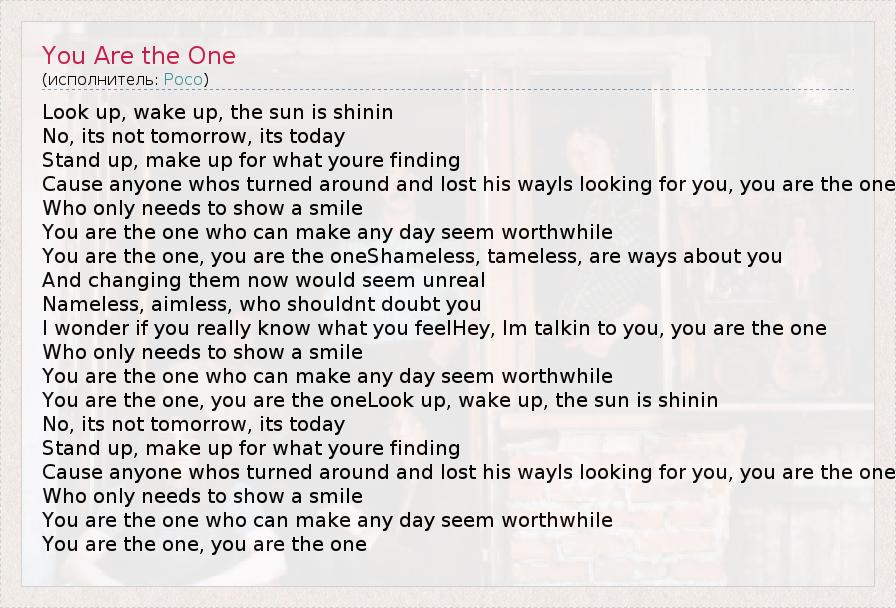 Look up, wake up, the sun is shinin No, its not tomorrow, its today Stand up, make up for what youre finding Cause anyone whos turned around and lost his wayIs looking for you, you are the one Who only needs to show a smile You are the one who can make any day seem worthwhile You are the one, you are the oneShameless, tameless, are ways about you And changing them now would seem unreal Nameless, aimless, who shouldnt doubt you I wonder if you really know what you feelHey, Im talkin to you, you are the one Who only needs to show a smile You are the one who can make any day seem worthwhile You are the one, you are the oneLook up, wake up, the sun is shinin No, its not tomorrow, its today Stand up, make up for what youre finding Cause anyone whos turned around and lost his wayIs looking for you, you are the one Who only needs to show a smile You are the one who can make any day seem worthwhile You are the one, you are the one
