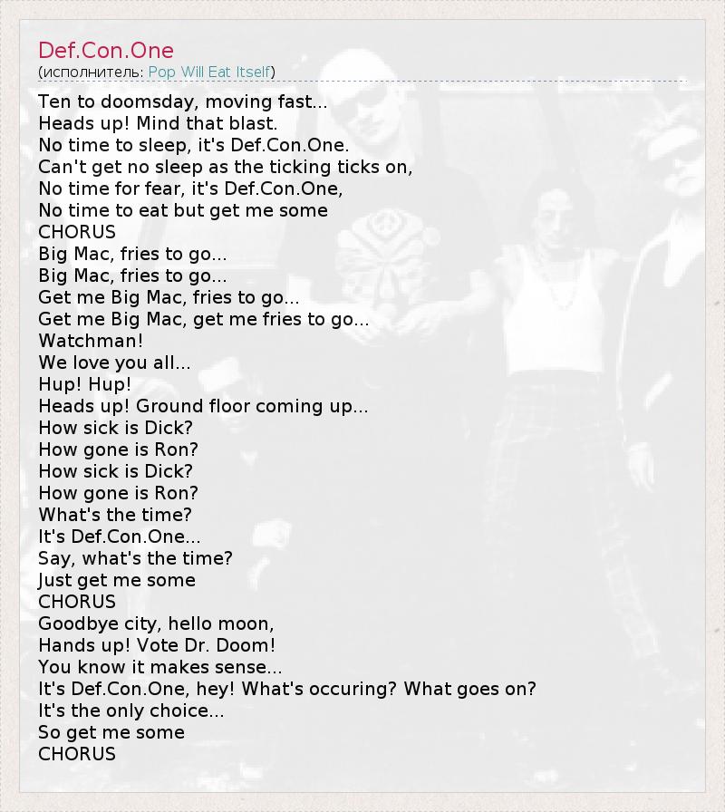 Ten to doomsday, moving fast... Heads up! Mind that blast. No time to sleep, it's Def.Con.One. Can't get no sleep as the ticking ticks on, No time for fear, it's Def.Con.One, No time to eat but get me some CHORUS Big Mac, fries to go... Big Mac, fries to go... Get me Big Mac, fries to go... Get me Big Mac, get me fries to go... Watchman! We love you all... Hup! Hup! Heads up! Ground floor coming up... How sick is Dick? How gone is Ron? How sick is Dick? How gone is Ron? What's the time? It's Def.Con.One... Say, what's the time? Just get me some CHORUS Goodbye city, hello moon, Hands up! Vote Dr. Doom! You know it makes sense... It's Def.Con.One, hey! What's occuring? What goes on? It's the only choice... So get me some CHORUS