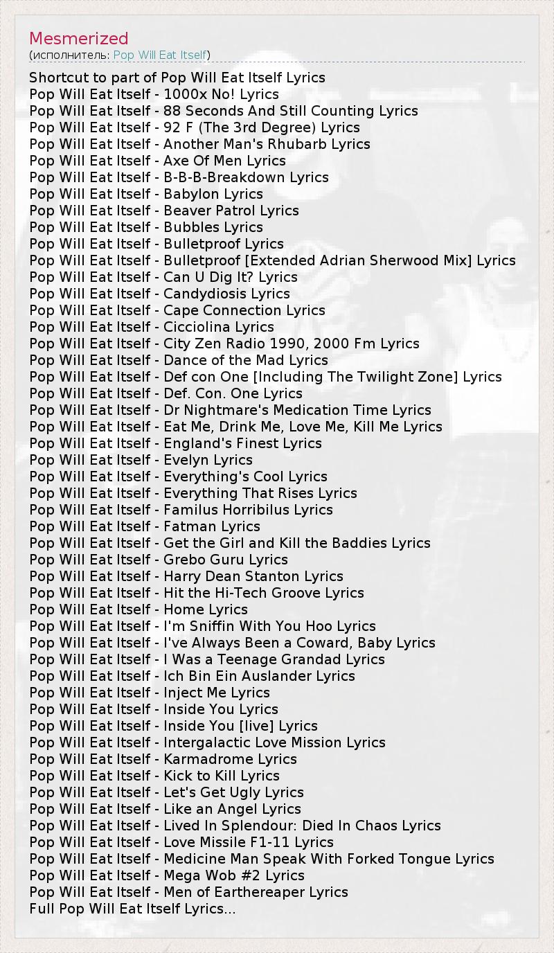 Shortcut to part of Pop Will Eat Itself Lyrics Pop Will Eat Itself - 1000x No! Lyrics Pop Will Eat Itself - 88 Seconds And Still Counting Lyrics Pop Will Eat Itself - 92 F (The 3rd Degree) Lyrics Pop Will Eat Itself - Another Man's Rhubarb Lyrics Pop Will Eat Itself - Axe Of Men Lyrics Pop Will Eat Itself - B-B-B-Breakdown Lyrics Pop Will Eat Itself - Babylon Lyrics Pop Will Eat Itself - Beaver Patrol Lyrics Pop Will Eat Itself - Bubbles Lyrics Pop Will Eat Itself - Bulletproof Lyrics Pop Will Eat Itself - Bulletproof [Extended Adrian Sherwood Mix] Lyrics Pop Will Eat Itself - Can U Dig It? Lyrics Pop Will Eat Itself - Candydiosis Lyrics Pop Will Eat Itself - Cape Connection Lyrics Pop Will Eat Itself - Cicciolina Lyrics Pop Will Eat Itself - City Zen Radio 1990, 2000 Fm Lyrics Pop Will Eat Itself - Dance of the Mad Lyrics Pop Will Eat Itself - Def con One [Including The Twilight Zone] Lyrics Pop Will Eat Itself - Def. Con. One Lyrics Pop Will Eat Itself - Dr Nightmare's Medication Time Lyrics Pop Will Eat Itself - Eat Me, Drink Me, Love Me, Kill Me Lyrics Pop Will Eat Itself - England's Finest Lyrics Pop Will Eat Itself - Evelyn Lyrics Pop Will Eat Itself - Everything's Cool Lyrics Pop Will Eat Itself - Everything That Rises Lyrics Pop Will Eat Itself - Familus Horribilus Lyrics Pop Will Eat Itself - Fatman Lyrics Pop Will Eat Itself - Get the Girl and Kill the Baddies Lyrics Pop Will Eat Itself - Grebo Guru Lyrics Pop Will Eat Itself - Harry Dean Stanton Lyrics Pop Will Eat Itself - Hit the Hi-Tech Groove Lyrics Pop Will Eat Itself - Home Lyrics Pop Will Eat Itself - I'm Sniffin With You Hoo Lyrics Pop Will Eat Itself - I've Always Been a Coward, Baby Lyrics Pop Will Eat Itself - I Was a Teenage Grandad Lyrics Pop Will Eat Itself - Ich Bin Ein Auslander Lyrics Pop Will Eat Itself - Inject Me Lyrics Pop Will Eat Itself - Inside You Lyrics Pop Will Eat Itself - Inside You [live] Lyrics Pop Will Eat Itself - Intergalactic Love Mission Lyrics Pop Will Eat Itself - Karmadrome Lyrics Pop Will Eat Itself - Kick to Kill Lyrics Pop Will Eat Itself - Let's Get Ugly Lyrics Pop Will Eat Itself - Like an Angel Lyrics Pop Will Eat Itself - Lived In Splendour: Died In Chaos Lyrics Pop Will Eat Itself - Love Missile F1-11 Lyrics Pop Will Eat Itself - Medicine Man Speak With Forked Tongue Lyrics Pop Will Eat Itself - Mega Wob #2 Lyrics Pop Will Eat Itself - Men of Earthereaper Lyrics Full Pop Will Eat Itself Lyrics...