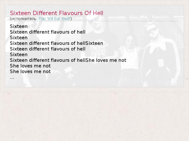 А как ты думаешь, о чем песня "Sixteen Different Flavours Of Hell" ?