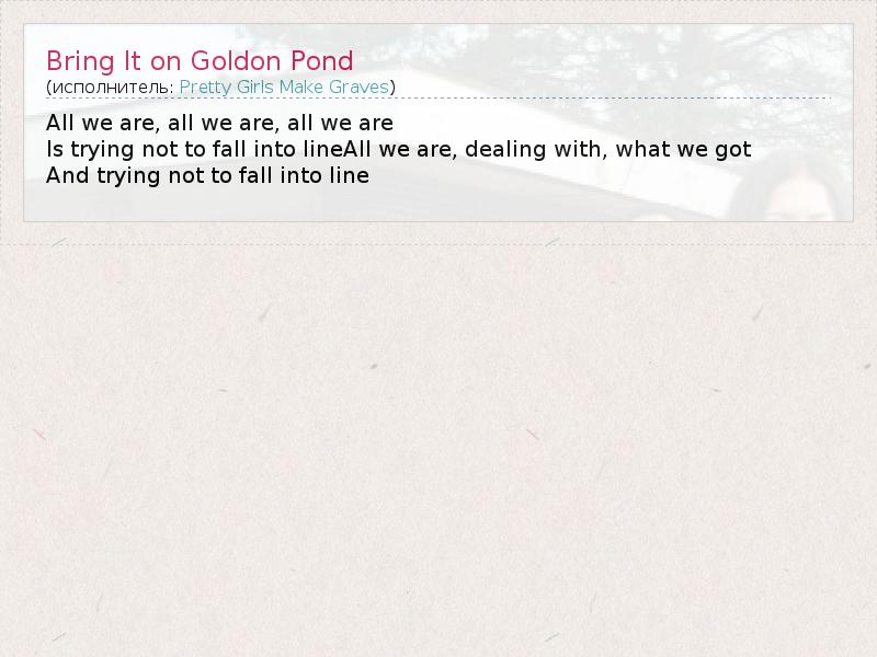 А как ты думаешь, о чем песня "Bring It on Goldon Pond" ?