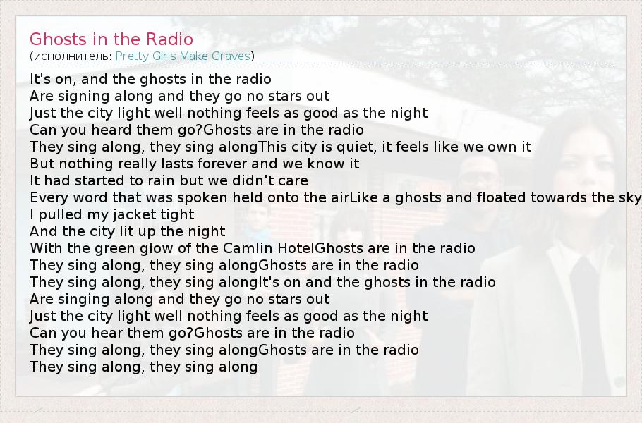 It's on, and the ghosts in the radio Are signing along and they go no stars out Just the city light well nothing feels as good as the night Can you heard them go?Ghosts are in the radio They sing along, they sing alongThis city is quiet, it feels like we own it But nothing really lasts forever and we know it It had started to rain but we didn't care Every word that was spoken held onto the airLike a ghosts and floated towards the sky I pulled my jacket tight And the city lit up the night With the green glow of the Camlin HotelGhosts are in the radio They sing along, they sing alongGhosts are in the radio They sing along, they sing alongIt's on and the ghosts in the radio Are singing along and they go no stars out Just the city light well nothing feels as good as the night Can you hear them go?Ghosts are in the radio They sing along, they sing alongGhosts are in the radio They sing along, they sing along