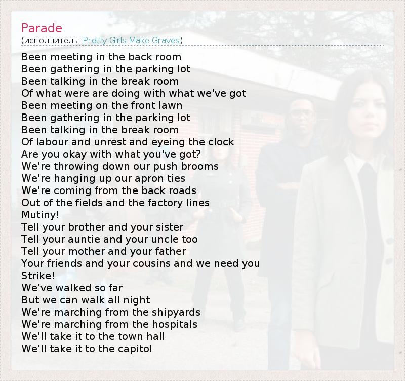 Been meeting in the back room Been gathering in the parking lot Been talking in the break room Of what were are doing with what we've got Been meeting on the front lawn Been gathering in the parking lot Been talking in the break room Of labour and unrest and eyeing the clock Are you okay with what you've got? We're throwing down our push brooms We're hanging up our apron ties We're coming from the back roads Out of the fields and the factory lines Mutiny! Tell your brother and your sister Tell your auntie and your uncle too Tell your mother and your father Your friends and your cousins and we need you Strike! We've walked so far But we can walk all night We're marching from the shipyards We're marching from the hospitals We'll take it to the town hall We'll take it to the capitol