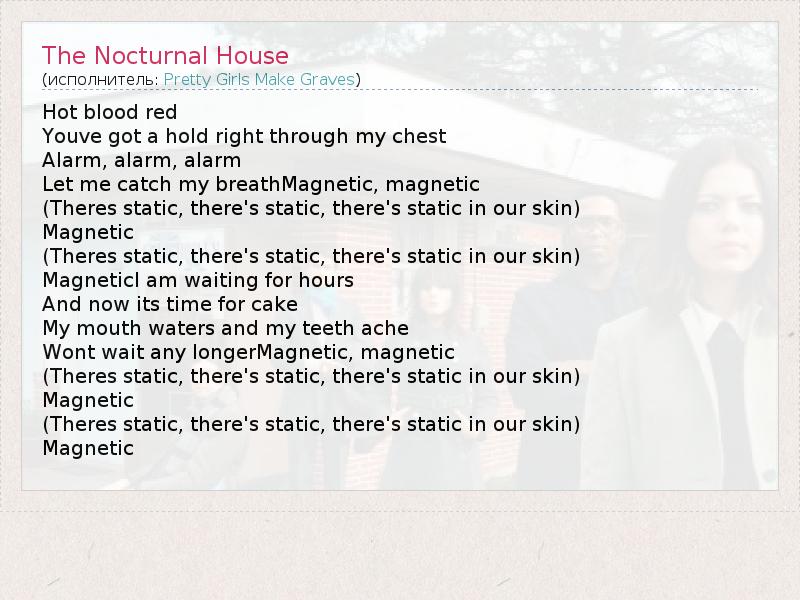 Hot blood red Youve got a hold right through my chest Alarm, alarm, alarm Let me catch my breathMagnetic, magnetic (Theres static, there's static, there's static in our skin) Magnetic (Theres static, there's static, there's static in our skin) MagneticI am waiting for hours And now its time for cake My mouth waters and my teeth ache Wont wait any longerMagnetic, magnetic (Theres static, there's static, there's static in our skin) Magnetic (Theres static, there's static, there's static in our skin) Magnetic