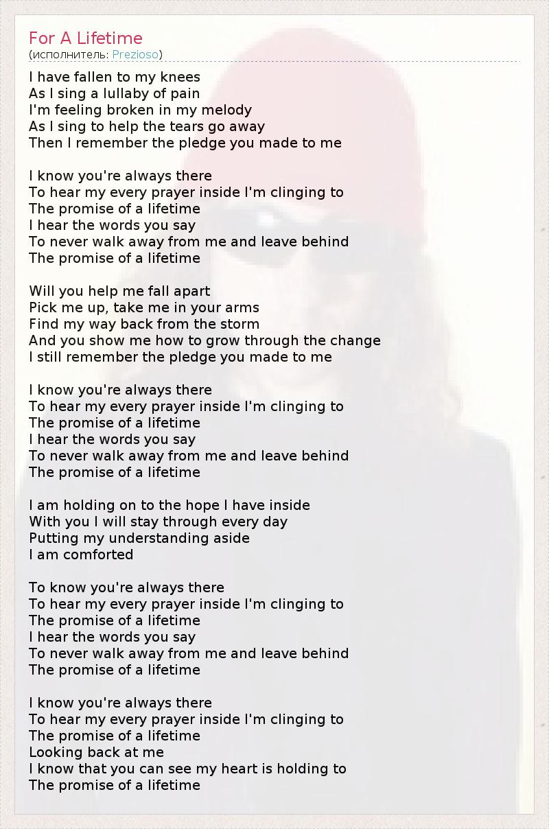 I have fallen to my knees As I sing a lullaby of pain I'm feeling broken in my melody As I sing to help the tears go away Then I remember the pledge you made to me I know you're always there To hear my every prayer inside I'm clinging to The promise of a lifetime I hear the words you say To never walk away from me and leave behind The promise of a lifetime Will you help me fall apart Pick me up, take me in your arms Find my way back from the storm And you show me how to grow through the change I still remember the pledge you made to me I know you're always there To hear my every prayer inside I'm clinging to The promise of a lifetime I hear the words you say To never walk away from me and leave behind The promise of a lifetime I am holding on to the hope I have inside With you I will stay through every day Putting my understanding aside I am comforted To know you're always there To hear my every prayer inside I'm clinging to The promise of a lifetime I hear the words you say To never walk away from me and leave behind The promise of a lifetime I know you're always there To hear my every prayer inside I'm clinging to The promise of a lifetime Looking back at me I know that you can see my heart is holding to The promise of a lifetime