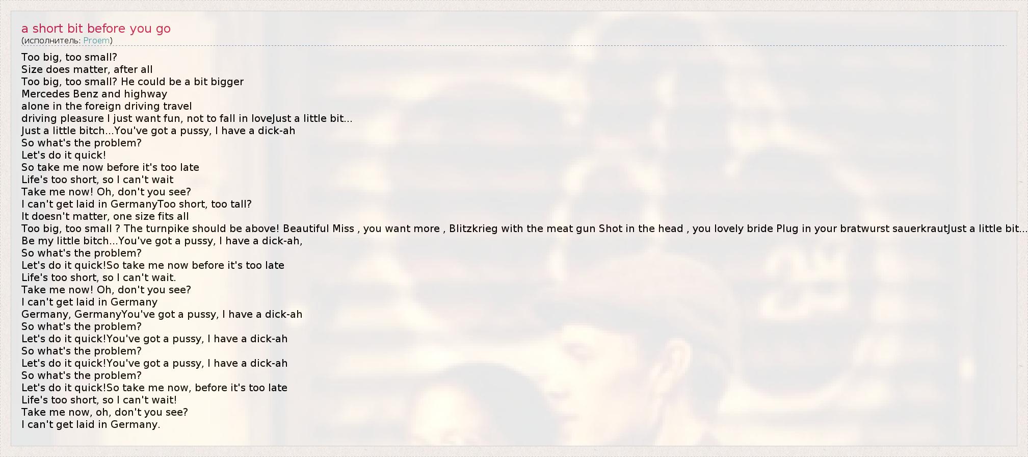 Too big, too small ? The turnpike should be above! Beautiful Miss , you want more , Blitzkrieg with the meat gun Shot in the head , you lovely bride Plug in your bratwurst sauerkrautJust a little bit...