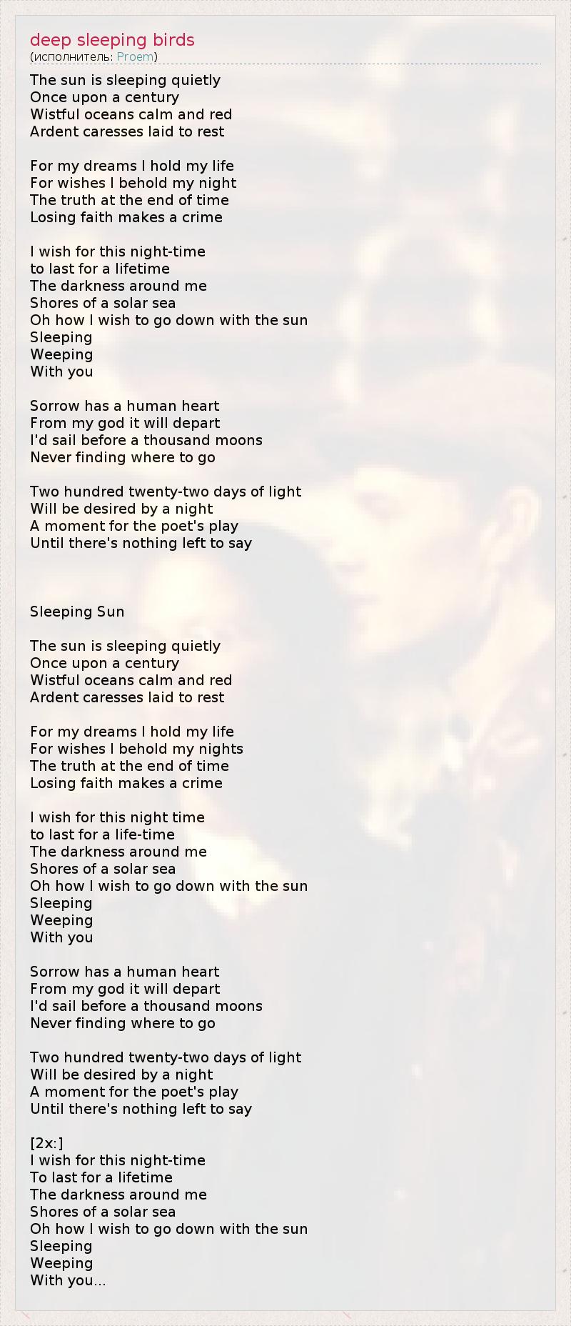 The sun is sleeping quietly Once upon a century Wistful oceans calm and red Ardent caresses laid to rest For my dreams I hold my life For wishes I behold my night The truth at the end of time Losing faith makes a crime I wish for this night-time to last for a lifetime The darkness around me Shores of a solar sea Oh how I wish to go down with the sun Sleeping Weeping With you Sorrow has a human heart From my god it will depart I'd sail before a thousand moons Never finding where to go Two hundred twenty-two days of light Will be desired by a night A moment for the poet's play Until there's nothing left to say Sleeping Sun The sun is sleeping quietly Once upon a century Wistful oceans calm and red Ardent caresses laid to rest For my dreams I hold my life For wishes I behold my nights The truth at the end of time Losing faith makes a crime I wish for this night time to last for a life-time The darkness around me Shores of a solar sea Oh how I wish to go down with the sun Sleeping Weeping With you Sorrow has a human heart From my god it will depart I'd sail before a thousand moons Never finding where to go Two hundred twenty-two days of light Will be desired by a night A moment for the poet's play Until there's nothing left to say [2x:] I wish for this night-time To last for a lifetime The darkness around me Shores of a solar sea Oh how I wish to go down with the sun Sleeping Weeping With you...