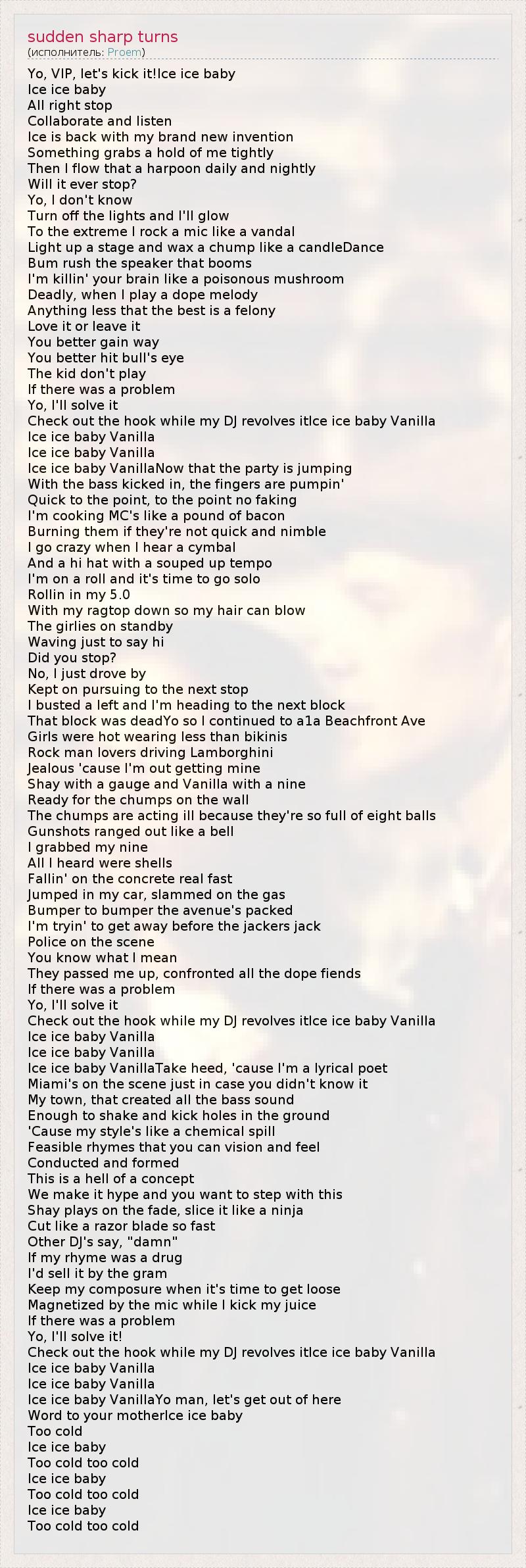 Yo, VIP, let's kick it!Ice ice baby Ice ice baby All right stop Collaborate and listen Ice is back with my brand new invention Something grabs a hold of me tightly Then I flow that a harpoon daily and nightly Will it ever stop? Yo, I don't know Turn off the lights and I'll glow To the extreme I rock a mic like a vandal Light up a stage and wax a chump like a candleDance Bum rush the speaker that booms I'm killin' your brain like a poisonous mushroom Deadly, when I play a dope melody Anything less that the best is a felony Love it or leave it You better gain way You better hit bull's eye The kid don't play If there was a problem Yo, I'll solve it Check out the hook while my DJ revolves itIce ice baby Vanilla Ice ice baby Vanilla Ice ice baby Vanilla Ice ice baby VanillaNow that the party is jumping With the bass kicked in, the fingers are pumpin' Quick to the point, to the point no faking I'm cooking MC's like a pound of bacon Burning them if they're not quick and nimble I go crazy when I hear a cymbal And a hi hat with a souped up tempo I'm on a roll and it's time to go solo Rollin in my 5.0 With my ragtop down so my hair can blow The girlies on standby Waving just to say hi Did you stop? No, I just drove by Kept on pursuing to the next stop I busted a left and I'm heading to the next block That block was deadYo so I continued to a1a Beachfront Ave Girls were hot wearing less than bikinis Rock man lovers driving Lamborghini Jealous 'cause I'm out getting mine Shay with a gauge and Vanilla with a nine Ready for the chumps on the wall The chumps are acting ill because they're so full of eight balls Gunshots ranged out like a bell I grabbed my nine All I heard were shells Fallin' on the concrete real fast Jumped in my car, slammed on the gas Bumper to bumper the avenue's packed I'm tryin' to get away before the jackers jack Police on the scene You know what I mean They passed me up, confronted all the dope fiends If there was a problem Yo, I'll solve it Check out the hook while my DJ revolves itIce ice baby Vanilla Ice ice baby Vanilla Ice ice baby Vanilla Ice ice baby VanillaTake heed, 'cause I'm a lyrical poet Miami's on the scene just in case you didn't know it My town, that created all the bass sound Enough to shake and kick holes in the ground 'Cause my style's like a chemical spill Feasible rhymes that you can vision and feel Conducted and formed This is a hell of a concept We make it hype and you want to step with this Shay plays on the fade, slice it like a ninja Cut like a razor blade so fast Other DJ's say, "damn" If my rhyme was a drug I'd sell it by the gram Keep my composure when it's time to get loose Magnetized by the mic while I kick my juice If there was a problem Yo, I'll solve it! Check out the hook while my DJ revolves itIce ice baby Vanilla Ice ice baby Vanilla Ice ice baby Vanilla Ice ice baby VanillaYo man, let's get out of here Word to your motherIce ice baby Too cold Ice ice baby Too cold too cold Ice ice baby Too cold too cold Ice ice baby Too cold too cold