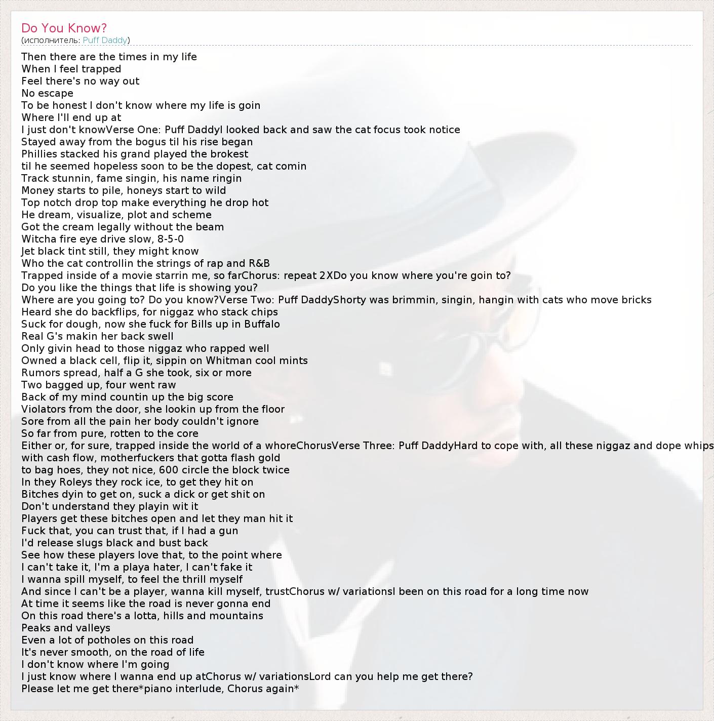 Then there are the times in my life When I feel trapped Feel there's no way out No escape To be honest I don't know where my life is goin Where I'll end up at I just don't knowVerse One: Puff DaddyI looked back and saw the cat focus took notice Stayed away from the bogus til his rise began Phillies stacked his grand played the brokest til he seemed hopeless soon to be the dopest, cat comin Track stunnin, fame singin, his name ringin Money starts to pile, honeys start to wild Top notch drop top make everything he drop hot He dream, visualize, plot and scheme Got the cream legally without the beam Witcha fire eye drive slow, 8-5-0 Jet black tint still, they might know Who the cat controllin the strings of rap and R&B Trapped inside of a movie starrin me, so farChorus: repeat 2XDo you know where you're goin to? Do you like the things that life is showing you? Where are you going to? Do you know?Verse Two: Puff DaddyShorty was brimmin, singin, hangin with cats who move bricks Heard she do backflips, for niggaz who stack chips Suck for dough, now she fuck for Bills up in Buffalo Real G's makin her back swell Only givin head to those niggaz who rapped well Owned a black cell, flip it, sippin on Whitman cool mints Rumors spread, half a G she took, six or more Two bagged up, four went raw Back of my mind countin up the big score Violators from the door, she lookin up from the floor Sore from all the pain her body couldn't ignore So far from pure, rotten to the core Either or, for sure, trapped inside the world of a whoreChorusVerse Three: Puff DaddyHard to cope with, all these niggaz and dope whips with cash flow, motherfuckers that gotta flash gold to bag hoes, they not nice, 600 circle the block twice In they Roleys they rock ice, to get they hit on Bitches dyin to get on, suck a dick or get shit on Don't understand they playin wit it Players get these bitches open and let they man hit it Fuck that, you can trust that, if I had a gun I'd release slugs black and bust back See how these players love that, to the point where I can't take it, I'm a playa hater, I can't fake it I wanna spill myself, to feel the thrill myself And since I can't be a player, wanna kill myself, trustChorus w/ variationsI been on this road for a long time now At time it seems like the road is never gonna end On this road there's a lotta, hills and mountains Peaks and valleys Even a lot of potholes on this road It's never smooth, on the road of life I don't know where I'm going I just know where I wanna end up atChorus w/ variationsLord can you help me get there? Please let me get there*piano interlude, Chorus again*