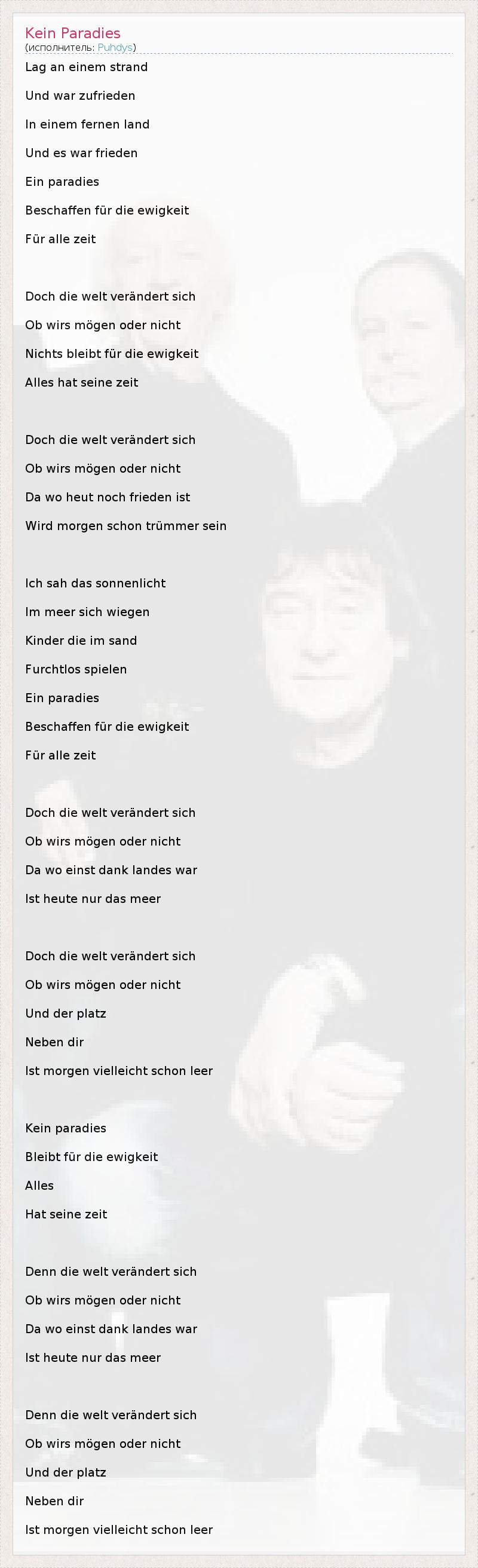 Lag an einem strand Und war zufrieden In einem fernen land Und es war frieden Ein paradies Beschaffen für die ewigkeit Für alle zeit Doch die welt verändert sich Ob wirs mögen oder nicht Nichts bleibt für die ewigkeit Alles hat seine zeit Doch die welt verändert sich Ob wirs mögen oder nicht Da wo heut noch frieden ist Wird morgen schon trümmer sein Ich sah das sonnenlicht Im meer sich wiegen Kinder die im sand Furchtlos spielen Ein paradies Beschaffen für die ewigkeit Für alle zeit Doch die welt verändert sich Ob wirs mögen oder nicht Da wo einst dank landes war Ist heute nur das meer Doch die welt verändert sich Ob wirs mögen oder nicht Und der platz Neben dir Ist morgen vielleicht schon leer Kein paradies Bleibt für die ewigkeit Alles Hat seine zeit Denn die welt verändert sich Ob wirs mögen oder nicht Da wo einst dank landes war Ist heute nur das meer Denn die welt verändert sich Ob wirs mögen oder nicht Und der platz Neben dir Ist morgen vielleicht schon leer