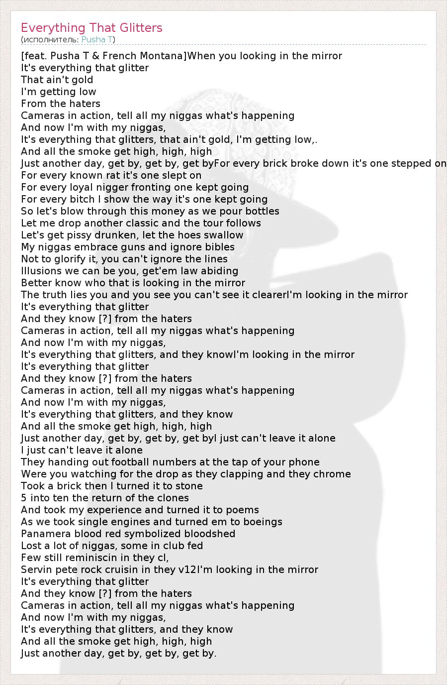 [feat. Pusha T & French Montana]When you looking in the mirror It's everything that glitter That ain't gold I'm getting low From the haters Cameras in action, tell all my niggas what's happening And now I'm with my niggas, It's everything that glitters, that ain't gold, I'm getting low,. And all the smoke get high, high, high Just another day, get by, get by, get byFor every brick broke down it's one stepped on For every known rat it's one slept on For every loyal nigger fronting one kept going For every bitch I show the way it's one kept going So let's blow through this money as we pour bottles Let me drop another classic and the tour follows Let's get pissy drunken, let the hoes swallow My niggas embrace guns and ignore bibles Not to glorify it, you can't ignore the lines Illusions we can be you, get'em law abiding Better know who that is looking in the mirror The truth lies you and you see you can't see it clearerI'm looking in the mirror It's everything that glitter And they know [?] from the haters Cameras in action, tell all my niggas what's happening And now I'm with my niggas, It's everything that glitters, and they knowI'm looking in the mirror It's everything that glitter And they know [?] from the haters Cameras in action, tell all my niggas what's happening And now I'm with my niggas, It's everything that glitters, and they know And all the smoke get high, high, high Just another day, get by, get by, get byI just can't leave it alone I just can't leave it alone They handing out football numbers at the tap of your phone Were you watching for the drop as they clapping and they chrome Took a brick then I turned it to stone 5 into ten the return of the clones And took my experience and turned it to poems As we took single engines and turned em to boeings Panamera blood red symbolized bloodshed Lost a lot of niggas, some in club fed Few still reminiscin in they cl, Servin pete rock cruisin in they v12I'm looking in the mirror It's everything that glitter And they know [?] from the haters Cameras in action, tell all my niggas what's happening And now I'm with my niggas, It's everything that glitters, and they know And all the smoke get high, high, high Just another day, get by, get by, get by.