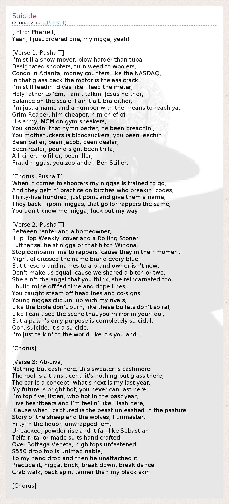 [Intro: Pharrell] Yeah, I just ordered one, my nigga, yeah! [Verse 1: Pusha T] I'm still a snow mover, blow harder than tuba, Designated shooters, turn weed to woolers, Condo in Atlanta, money counters like the NASDAQ, In that glass back the motor is the ass crack. I'm still feedin' divas like I feed the meter, Holy father to ‘em, I ain't talkin' Jesus neither, Balance on the scale, I ain't a Libra either, I'm just a name and a number with the means to reach ya. Grim Reaper, him cheaper, him chief of His army, MCM on gym sneakers, You knowin' that hymn better, he been preachin', You mothafuckers is bloodsuckers, you been leechin'. Been baller, been Jacob, been dealer, Been realer, pound sign, been trilla, All killer, no filler, been iller, Fraud niggas, you zoolander, Ben Stiller. [Chorus: Pusha T] When it comes to shooters my niggas is trained to go, And they gettin' practice on bitches who breakin' codes, Thirty-five hundred, just point and give them a name, They back flippin' niggas, that go for rappers the same, You don't know me, nigga, fuck out my way! [Verse 2: Pusha T] Between renter and a homeowner, ‘Hip Hop Weekly' cover and a Rolling Stoner, Lufthansa, heist nigga or that bitch Winona, Stop comparin' me to rappers ‘cause they in their moment. Might of crossed the name brand every blue, But these brand names to a brand owner isn't new, Don't make us equal ‘cause we shared a bitch or two, She ain't the angel that you think, she reincarnated too. I build mine off fed time and dope lines, You caught steam off headlines and co-signs, Young niggas cliquin' up with my rivals, Like the bible don't burn, like these bullets don't spiral, Like I can't see the scene that you mirror in your idol, But a pawn's only purpose is completely suicidal, Ooh, suicide, it's a suicide, I'm just talkin' to the world like it's you and I. [Chorus] [Verse 3: Ab-Liva] Nothing but cash here, this sweater is cashmere, The roof is a translucent, it's nothing but glass there, The car is a concept, what's next is my last year, My future is bright hot, you never can last here. I'm top five, listen, who hot in the past year, Five heartbeats and I'm feelin' like Flash here, ‘Cause what I captured is the beast unleashed in the pasture, Story of the sheep and the wolves, I unmaster. Fifty in the liquor, unwrapped ‘em, Unpacked, powder rise and it fall like Sebastian Telfair, tailor-made suits hand crafted, Over Bottega Veneta, high tops unfastened. S550 drop top is unimaginable, To my hand drop and then he unattached it, Practice it, nigga, brick, break down, break dance, Crab walk, back spin, tanner than my black skin. [Chorus]