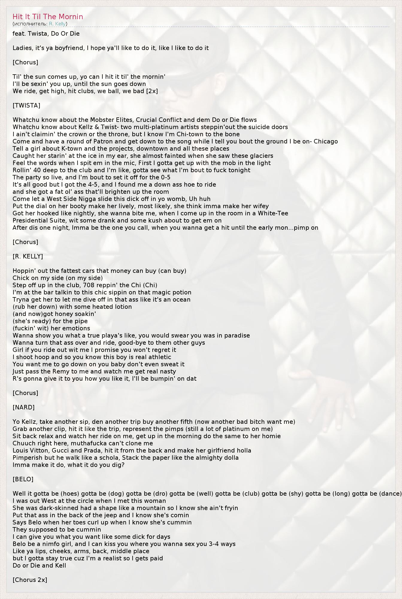 feat. Twista, Do Or Die Ladies, it's ya boyfriend, I hope ya'll like to do it, like I like to do it [Chorus] Til' the sun comes up, yo can I hit it til' the mornin' I'll be sexin' you up, until the sun goes down We ride, get high, hit clubs, we ball, we bad [2x] [TWISTA] Whatchu know about the Mobster Elites, Crucial Conflict and dem Do or Die flows Whatchu know about Kellz & Twist- two multi-platinum artists steppin'out the suicide doors I ain't claimin' the crown or the throne, but I know I'm Chi-town to the bone Come and have a round of Patron and get down to the song while I tell you bout the ground I be on- Chicago Tell a girl about K-town and the projects, downtown and all these places Caught her starin' at the ice in my ear, she almost fainted when she saw these glaciers Feel the words when I spit em in the mic, First I gotta get up with the mob in the light Rollin' 40 deep to the club and I'm like, gotta see what I'm bout to fuck tonight The party so live, and I'm bout to set it off for the 0-5 It's all good but I got the 4-5, and I found me a down ass hoe to ride and she got a fat ol' ass that'll brighten up the room Come let a West Side Nigga slide this dick off in yo womb, Uh huh Put the dial on her booty make her lively, most likely, she think imma make her wifey Got her hooked like nightly, she wanna bite me, when I come up in the room in a White-Tee Presidential Suite, wit some drank and some kush about to get em on After dis one night, Imma be the one you call, when you wanna get a hit until the early mon...pimp on [Chorus] [R. KELLY] Hoppin' out the fattest cars that money can buy (can buy) Chick on my side (on my side) Step off up in the club, 708 reppin' the Chi (Chi) I'm at the bar talkin to this chic sippin on that magic potion Tryna get her to let me dive off in that ass like it's an ocean (rub her down) with some heated lotion (and now)got honey soakin' (she's ready) for the pipe (fuckin' wit) her emotions Wanna show you what a true playa's like, you would swear you was in paradise Wanna turn that ass over and ride, good-bye to them other guys Girl if you ride out wit me I promise you won't regret it I shoot hoop and so you know this boy is real athletic You want me to go down on you baby don't even sweat it Just pass the Remy to me and watch me get real nasty R's gonna give it to you how you like it, I'll be bumpin' on dat [Chorus] [NARD] Yo Kellz, take another sip, den another trip buy another fifth (now another bad bitch want me) Grab another clip, hit it like the trip, represent the pimps (still a lot of platinum on me) Sit back relax and watch her ride on me, get up in the morning do the same to her homie Chuuch right here, muthafucka can't clone me Louis Vitton, Gucci and Prada, hit it from the back and make her girlfriend holla Pimperish but he walk like a schola, Stack the paper like the almighty dolla Imma make it do, what it do you dig? [BELO] Well it gotta be (hoes) gotta be (dog) gotta be (dro) gotta be (well) gotta be (club) gotta be (shy) gotta be (long) gotta be (dance) I was out West at the circle when I met this woman She was dark-skinned had a shape like a mountain so I know she ain't fryin Put that ass in the back of the jeep and I know she's comin Says Belo when her toes curl up when I know she's cummin They supposed to be cummin I can give you what you want like some dick for days Belo be a nimfo girl, and I can kiss you where you wanna sex you 3-4 ways Like ya lips, cheeks, arms, back, middle place but I gotta stay true cuz I'm a realist so I gets paid Do or Die and Kell [Chorus 2x]