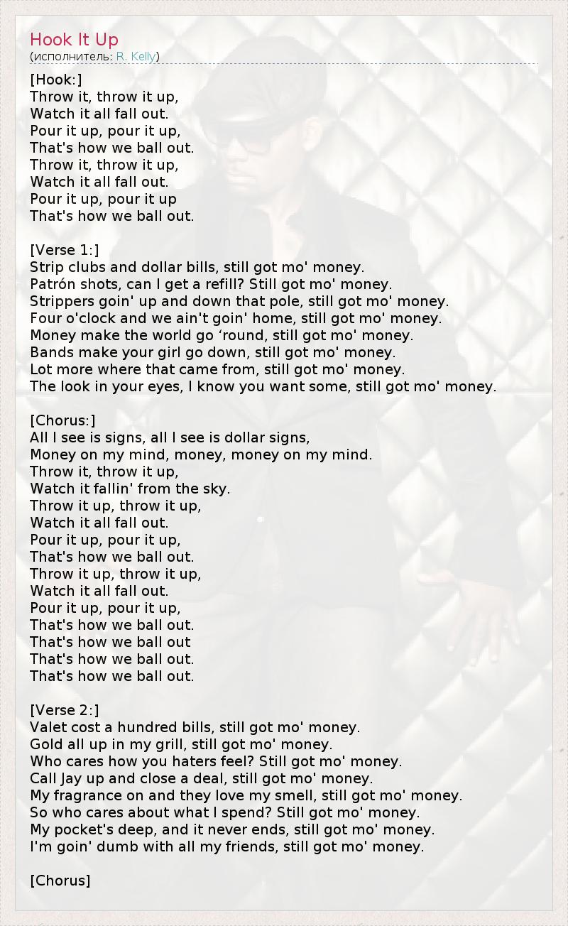 [Hook:] Throw it, throw it up, Watch it all fall out. Pour it up, pour it up, That's how we ball out. Throw it, throw it up, Watch it all fall out. Pour it up, pour it up That's how we ball out. [Verse 1:] Strip clubs and dollar bills, still got mo' money. Patrón shots, can I get a refill? Still got mo' money. Strippers goin' up and down that pole, still got mo' money. Four o'clock and we ain't goin' home, still got mo' money. Money make the world go ‘round, still got mo' money. Bands make your girl go down, still got mo' money. Lot more where that came from, still got mo' money. The look in your eyes, I know you want some, still got mo' money. [Chorus:] All I see is signs, all I see is dollar signs, Money on my mind, money, money on my mind. Throw it, throw it up, Watch it fallin' from the sky. Throw it up, throw it up, Watch it all fall out. Pour it up, pour it up, That's how we ball out. Throw it up, throw it up, Watch it all fall out. Pour it up, pour it up, That's how we ball out. That's how we ball out That's how we ball out. That's how we ball out. [Verse 2:] Valet cost a hundred bills, still got mo' money. Gold all up in my grill, still got mo' money. Who cares how you haters feel? Still got mo' money. Call Jay up and close a deal, still got mo' money. My fragrance on and they love my smell, still got mo' money. So who cares about what I spend? Still got mo' money. My pocket's deep, and it never ends, still got mo' money. I'm goin' dumb with all my friends, still got mo' money. [Chorus]