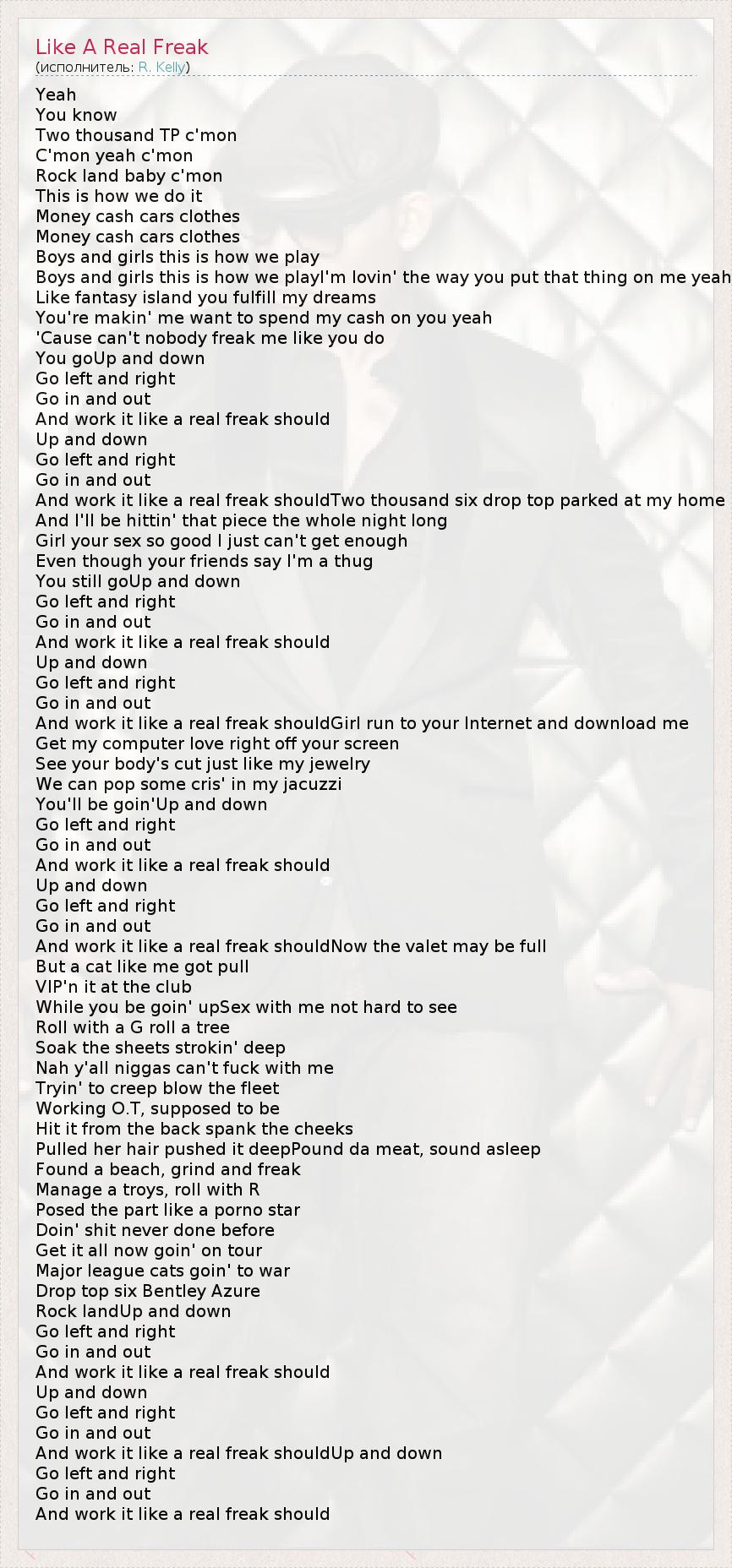 Yeah You know Two thousand TP c'mon C'mon yeah c'mon Rock land baby c'mon This is how we do it Money cash cars clothes Money cash cars clothes Boys and girls this is how we play Boys and girls this is how we playI'm lovin' the way you put that thing on me yeah Like fantasy island you fulfill my dreams You're makin' me want to spend my cash on you yeah 'Cause can't nobody freak me like you do You goUp and down Go left and right Go in and out And work it like a real freak should Up and down Go left and right Go in and out And work it like a real freak shouldTwo thousand six drop top parked at my home And I'll be hittin' that piece the whole night long Girl your sex so good I just can't get enough Even though your friends say I'm a thug You still goUp and down Go left and right Go in and out And work it like a real freak should Up and down Go left and right Go in and out And work it like a real freak shouldGirl run to your Internet and download me Get my computer love right off your screen See your body's cut just like my jewelry We can pop some cris' in my jacuzzi You'll be goin'Up and down Go left and right Go in and out And work it like a real freak should Up and down Go left and right Go in and out And work it like a real freak shouldNow the valet may be full But a cat like me got pull VIP'n it at the club While you be goin' upSex with me not hard to see Roll with a G roll a tree Soak the sheets strokin' deep Nah y'all niggas can't fuck with me Tryin' to creep blow the fleet Working O.T, supposed to be Hit it from the back spank the cheeks Pulled her hair pushed it deepPound da meat, sound asleep Found a beach, grind and freak Manage a troys, roll with R Posed the part like a porno star Doin' shit never done before Get it all now goin' on tour Major league cats goin' to war Drop top six Bentley Azure Rock landUp and down Go left and right Go in and out And work it like a real freak should Up and down Go left and right Go in and out And work it like a real freak shouldUp and down Go left and right Go in and out And work it like a real freak should