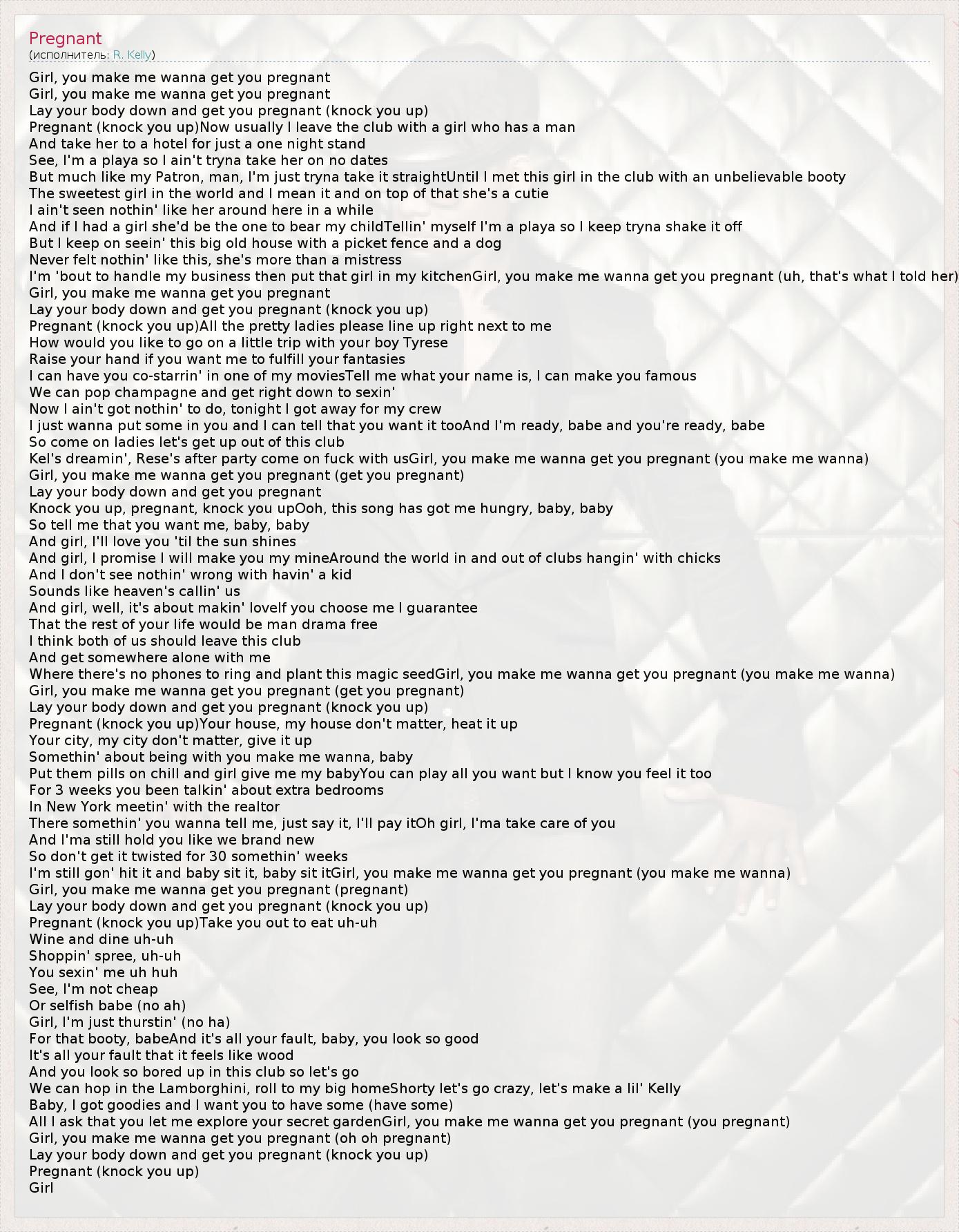 Girl, you make me wanna get you pregnant Girl, you make me wanna get you pregnant Lay your body down and get you pregnant (knock you up) Pregnant (knock you up)Now usually I leave the club with a girl who has a man And take her to a hotel for just a one night stand See, I'm a playa so I ain't tryna take her on no dates But much like my Patron, man, I'm just tryna take it straightUntil I met this girl in the club with an unbelievable booty The sweetest girl in the world and I mean it and on top of that she's a cutie I ain't seen nothin' like her around here in a while And if I had a girl she'd be the one to bear my childTellin' myself I'm a playa so I keep tryna shake it off But I keep on seein' this big old house with a picket fence and a dog Never felt nothin' like this, she's more than a mistress I'm 'bout to handle my business then put that girl in my kitchenGirl, you make me wanna get you pregnant (uh, that's what I told her) Girl, you make me wanna get you pregnant Lay your body down and get you pregnant (knock you up) Pregnant (knock you up)All the pretty ladies please line up right next to me How would you like to go on a little trip with your boy Tyrese Raise your hand if you want me to fulfill your fantasies I can have you co-starrin' in one of my moviesTell me what your name is, I can make you famous We can pop champagne and get right down to sexin' Now I ain't got nothin' to do, tonight I got away for my crew I just wanna put some in you and I can tell that you want it tooAnd I'm ready, babe and you're ready, babe So come on ladies let's get up out of this club Kel's dreamin', Rese's after party come on fuck with usGirl, you make me wanna get you pregnant (you make me wanna) Girl, you make me wanna get you pregnant (get you pregnant) Lay your body down and get you pregnant Knock you up, pregnant, knock you upOoh, this song has got me hungry, baby, baby So tell me that you want me, baby, baby And girl, I'll love you 'til the sun shines And girl, I promise I will make you my mineAround the world in and out of clubs hangin' with chicks And I don't see nothin' wrong with havin' a kid Sounds like heaven's callin' us And girl, well, it's about makin' loveIf you choose me I guarantee That the rest of your life would be man drama free I think both of us should leave this club And get somewhere alone with me Where there's no phones to ring and plant this magic seedGirl, you make me wanna get you pregnant (you make me wanna) Girl, you make me wanna get you pregnant (get you pregnant) Lay your body down and get you pregnant (knock you up) Pregnant (knock you up)Your house, my house don't matter, heat it up Your city, my city don't matter, give it up Somethin' about being with you make me wanna, baby Put them pills on chill and girl give me my babyYou can play all you want but I know you feel it too For 3 weeks you been talkin' about extra bedrooms In New York meetin' with the realtor There somethin' you wanna tell me, just say it, I'll pay itOh girl, I'ma take care of you And I'ma still hold you like we brand new So don't get it twisted for 30 somethin' weeks I'm still gon' hit it and baby sit it, baby sit itGirl, you make me wanna get you pregnant (you make me wanna) Girl, you make me wanna get you pregnant (pregnant) Lay your body down and get you pregnant (knock you up) Pregnant (knock you up)Take you out to eat uh-uh Wine and dine uh-uh Shoppin' spree, uh-uh You sexin' me uh huh See, I'm not cheap Or selfish babe (no ah) Girl, I'm just thurstin' (no ha) For that booty, babeAnd it's all your fault, baby, you look so good It's all your fault that it feels like wood And you look so bored up in this club so let's go We can hop in the Lamborghini, roll to my big homeShorty let's go crazy, let's make a lil' Kelly Baby, I got goodies and I want you to have some (have some) All I ask that you let me explore your secret gardenGirl, you make me wanna get you pregnant (you pregnant) Girl, you make me wanna get you pregnant (oh oh pregnant) Lay your body down and get you pregnant (knock you up) Pregnant (knock you up) Girl