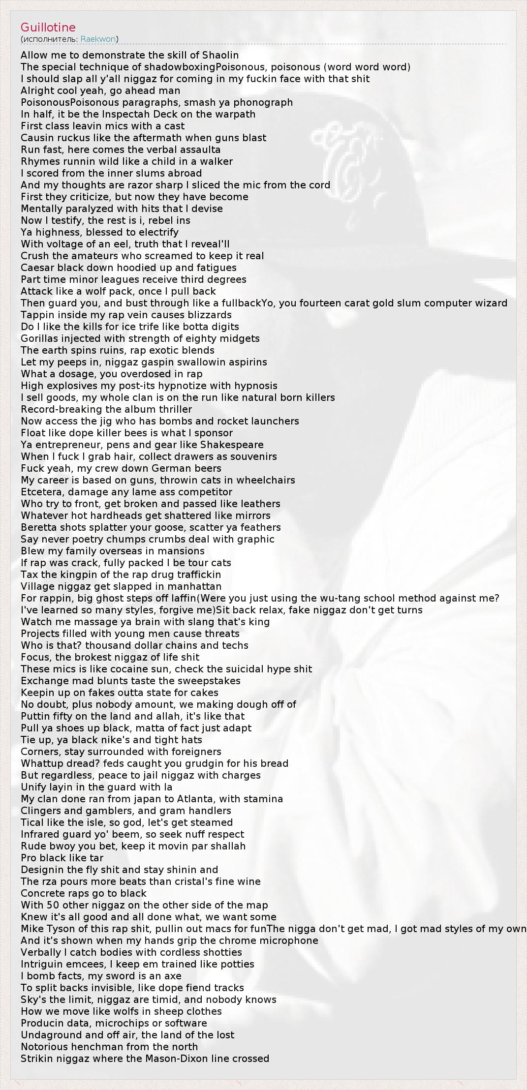 Рае не был хорошим лириком, но у него другой талант – он хорошо рассказывает истории. В этом и есть изюминка этого альбома. Вкупе с сэмплами из гангстерских фильмов он проводит параллель с уличными историями Нью-Йорка 90-х. Простые, но необыкновенно красочные и жизненные истории, которые рассказывали Рае и Гост не оставят равнодушным никого. Все это очень завораживает и затягивает. Голос Раеквона - сильный, в нем чувствуется власть, мощь, подобно голосам тех легендарных мафиози, которых великолепно играли Аль Пачино, Марлон Брандо и другие великие актеры.