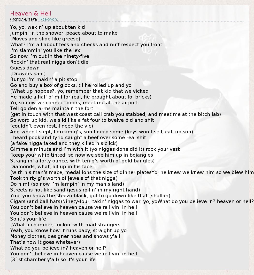 Yo, yo, wakin' up about ten kid Jumpin' in the shower, peace about to make (Moves and slide like greese) What? I'm all about tecs and checks and nuff respect you front I'm slammin' you like the lex So now I'm out in the ninety-five Rockin' that real nigga don't die Guess down (Drawers kani) But yo I'm makin' a pit stop Go and buy a box of glocks, til he rolled up and yo (What up hobbes?, yo, remember that kid that we vicked He made a half of mil for real, he brought about fo' bricks) Yo, so now we connect doors, meet me at the airport Tell golden arms maintain the fort (get in touch with that west coast cali crab you stabbed, and meet me at the bitch lab) So word up kid, we slid like a fat four to twelve bid and shit (couldn't even rest, I need the vic) And when I slept, I dream g's, son I need some (keys won't sell, call up son) I heard pook and tyriq caught a beef over some real shit (a fake nigga faked and they killed his click) Gimme a minute and I'm with it (yo niggas done did it) rock your vest (keep your whip tinted, so now we see him up in bojangles Stranglin' a forty ounce, with ten g's worth of gold bangles) Diamonds, what, all up in his face (with his man's mace, medallions the size of dinner platesYo, he knew we knew him so we blew him Took thirty g's worth of jewels of that nigga) Do him! (so now I'm lampin' in my man's land) Streets is hot like sand (jesus rollin' in my right hand) Yup, you know the steezo black, got to go down like that (shallah) Cigars (and ball hats)Ninety-four, takin' niggas to war, yo, yoWhat do you believe in? heaven or hell? You don't believe in heaven cause we're livin' in hell You don't believe in heaven cause we're livin' in hell So it's your life (What a chamber, fuckin' with mad strangers Yeah, you know how it runs baby, straight up yo Money clothes, designer hoes and shows y'all That's how it goes whatever) What do you believe in? heaven or hell? You don't believe in heaven cause we're livin' in hell (31st chamber y'all) so it's your life