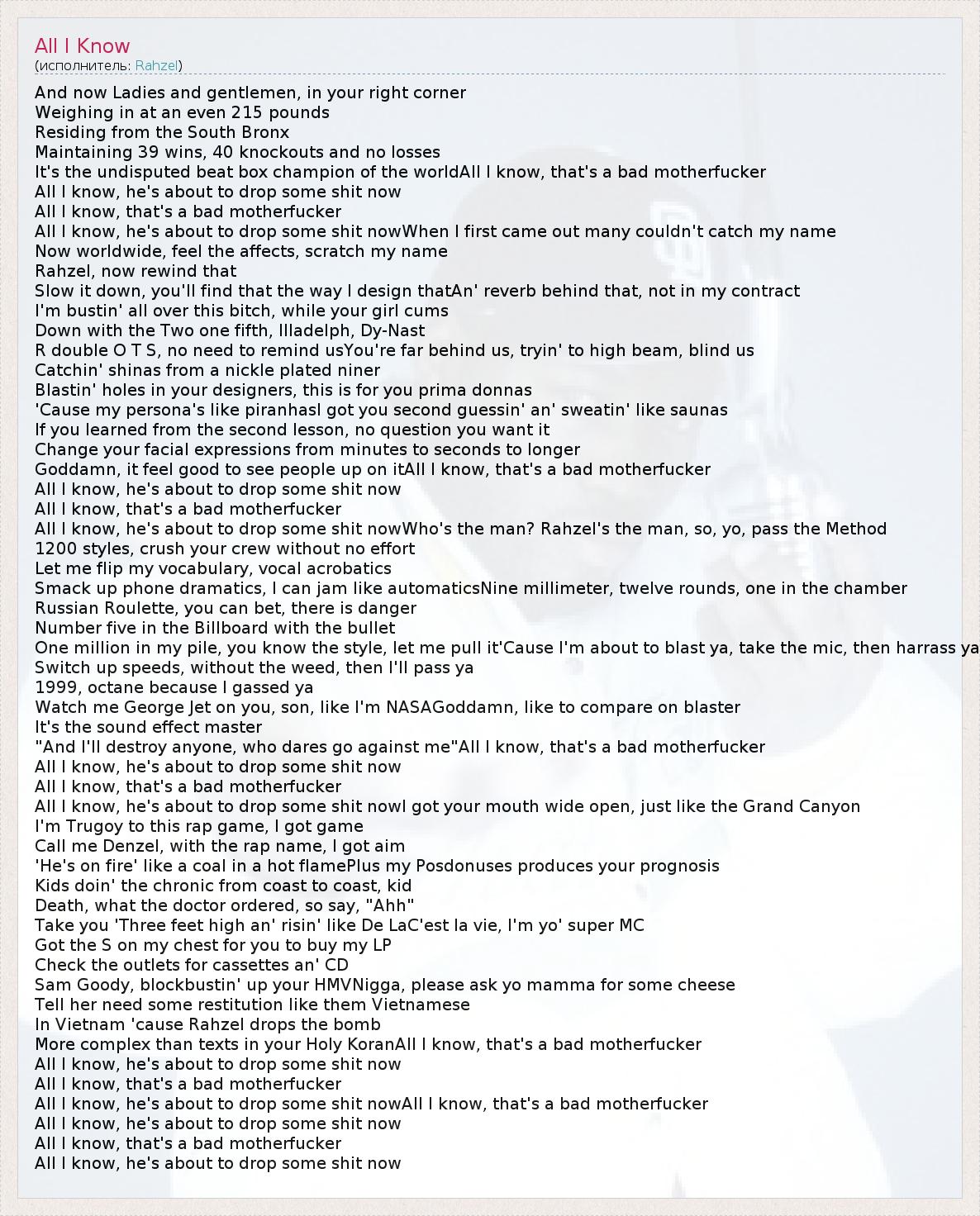All I know, he's about to drop some shit nowAll I know, that's a bad motherfucker