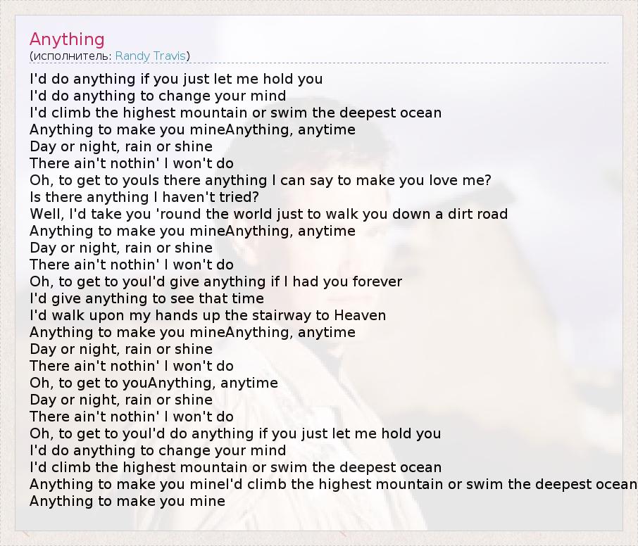 I'd do anything if you just let me hold you I'd do anything to change your mind I'd climb the highest mountain or swim the deepest ocean Anything to make you mineAnything, anytime Day or night, rain or shine There ain't nothin' I won't do Oh, to get to youIs there anything I can say to make you love me? Is there anything I haven't tried? Well, I'd take you 'round the world just to walk you down a dirt road Anything to make you mineAnything, anytime Day or night, rain or shine There ain't nothin' I won't do Oh, to get to youI'd give anything if I had you forever I'd give anything to see that time I'd walk upon my hands up the stairway to Heaven Anything to make you mineAnything, anytime Day or night, rain or shine There ain't nothin' I won't do Oh, to get to youAnything, anytime Day or night, rain or shine There ain't nothin' I won't do Oh, to get to youI'd do anything if you just let me hold you I'd do anything to change your mind I'd climb the highest mountain or swim the deepest ocean Anything to make you mineI'd climb the highest mountain or swim the deepest ocean Anything to make you mine