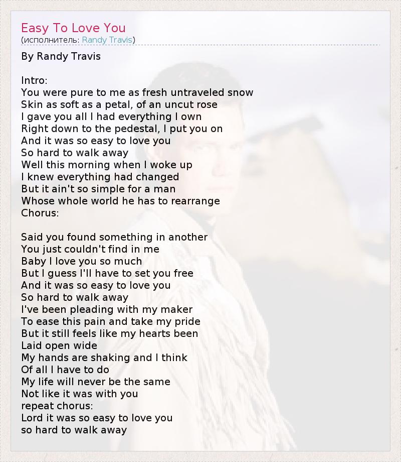 By Randy Travis Intro: You were pure to me as fresh untraveled snow Skin as soft as a petal, of an uncut rose I gave you all I had everything I own Right down to the pedestal, I put you on And it was so easy to love you So hard to walk away Well this morning when I woke up I knew everything had changed But it ain't so simple for a man Whose whole world he has to rearrange Chorus: Said you found something in another You just couldn't find in me Baby I love you so much But I guess I'll have to set you free And it was so easy to love you So hard to walk away I've been pleading with my maker To ease this pain and take my pride But it still feels like my hearts been Laid open wide My hands are shaking and I think Of all I have to do My life will never be the same Not like it was with you repeat chorus: Lord it was so easy to love you so hard to walk away