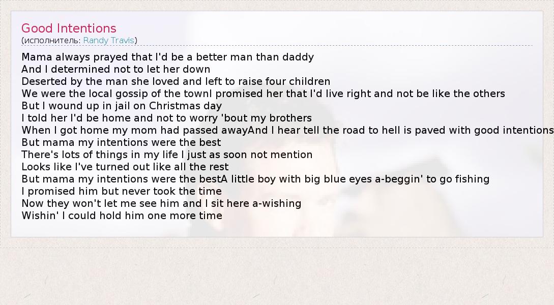 Mama always prayed that I'd be a better man than daddy And I determined not to let her down Deserted by the man she loved and left to raise four children We were the local gossip of the townI promised her that I'd live right and not be like the others But I wound up in jail on Christmas day I told her I'd be home and not to worry 'bout my brothers When I got home my mom had passed awayAnd I hear tell the road to hell is paved with good intentions But mama my intentions were the best There's lots of things in my life I just as soon not mention Looks like I've turned out like all the rest But mama my intentions were the bestA little boy with big blue eyes a-beggin' to go fishing I promised him but never took the time Now they won't let me see him and I sit here a-wishing Wishin' I could hold him one more time