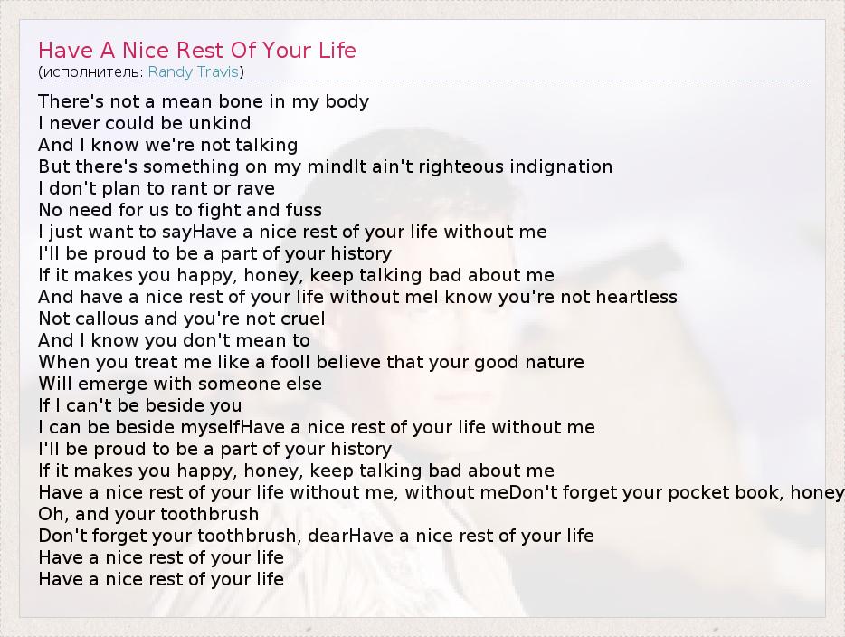 There's not a mean bone in my body I never could be unkind And I know we're not talking But there's something on my mindIt ain't righteous indignation I don't plan to rant or rave No need for us to fight and fuss I just want to sayHave a nice rest of your life without me I'll be proud to be a part of your history If it makes you happy, honey, keep talking bad about me And have a nice rest of your life without meI know you're not heartless Not callous and you're not cruel And I know you don't mean to When you treat me like a foolI believe that your good nature Will emerge with someone else If I can't be beside you I can be beside myselfHave a nice rest of your life without me I'll be proud to be a part of your history If it makes you happy, honey, keep talking bad about me Have a nice rest of your life without me, without meDon't forget your pocket book, honey Oh, and your toothbrush Don't forget your toothbrush, dearHave a nice rest of your life Have a nice rest of your life Have a nice rest of your life