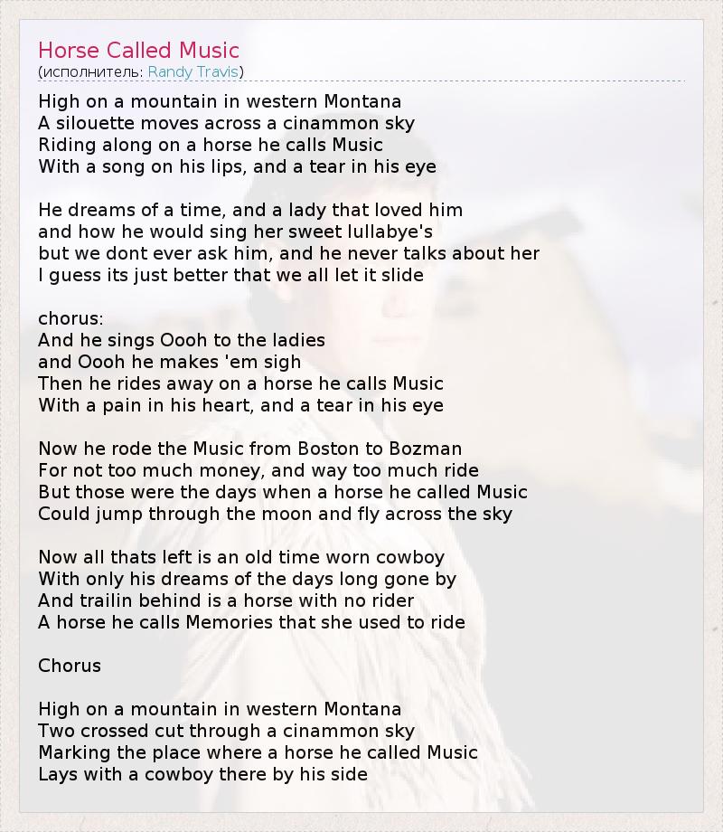 High on a mountain in western Montana A silouette moves across a cinammon sky Riding along on a horse he calls Music With a song on his lips, and a tear in his eye He dreams of a time, and a lady that loved him and how he would sing her sweet lullabye's but we dont ever ask him, and he never talks about her I guess its just better that we all let it slide chorus: And he sings Oooh to the ladies and Oooh he makes 'em sigh Then he rides away on a horse he calls Music With a pain in his heart, and a tear in his eye Now he rode the Music from Boston to Bozman For not too much money, and way too much ride But those were the days when a horse he called Music Could jump through the moon and fly across the sky Now all thats left is an old time worn cowboy With only his dreams of the days long gone by And trailin behind is a horse with no rider A horse he calls Memories that she used to ride Chorus High on a mountain in western Montana Two crossed cut through a cinammon sky Marking the place where a horse he called Music Lays with a cowboy there by his side
