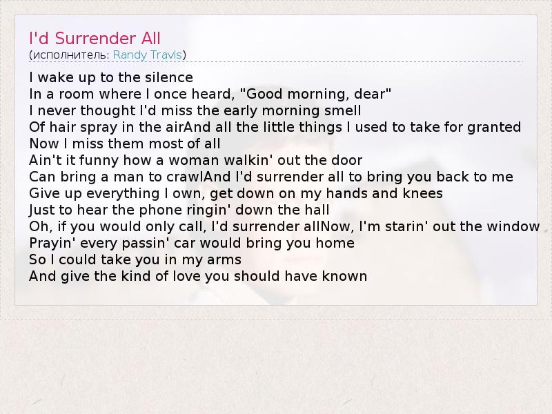 I wake up to the silence In a room where I once heard, "Good morning, dear" I never thought I'd miss the early morning smell Of hair spray in the airAnd all the little things I used to take for granted Now I miss them most of all Ain't it funny how a woman walkin' out the door Can bring a man to crawlAnd I'd surrender all to bring you back to me Give up everything I own, get down on my hands and knees Just to hear the phone ringin' down the hall Oh, if you would only call, I'd surrender allNow, I'm starin' out the window Prayin' every passin' car would bring you home So I could take you in my arms And give the kind of love you should have known