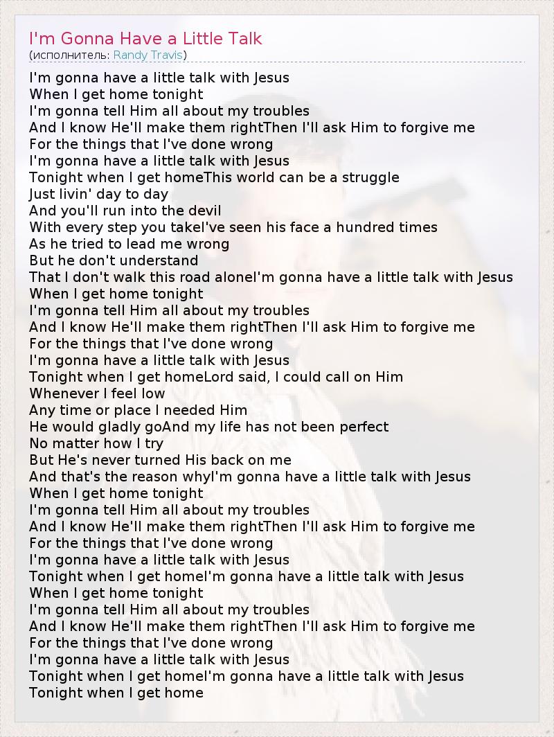 I'm gonna have a little talk with Jesus When I get home tonight I'm gonna tell Him all about my troubles And I know He'll make them rightThen I'll ask Him to forgive me For the things that I've done wrong I'm gonna have a little talk with Jesus Tonight when I get homeThis world can be a struggle Just livin' day to day And you'll run into the devil With every step you takeI've seen his face a hundred times As he tried to lead me wrong But he don't understand That I don't walk this road aloneI'm gonna have a little talk with Jesus When I get home tonight I'm gonna tell Him all about my troubles And I know He'll make them rightThen I'll ask Him to forgive me For the things that I've done wrong I'm gonna have a little talk with Jesus Tonight when I get homeLord said, I could call on Him Whenever I feel low Any time or place I needed Him He would gladly goAnd my life has not been perfect No matter how I try But He's never turned His back on me And that's the reason whyI'm gonna have a little talk with Jesus When I get home tonight I'm gonna tell Him all about my troubles And I know He'll make them rightThen I'll ask Him to forgive me For the things that I've done wrong I'm gonna have a little talk with Jesus Tonight when I get homeI'm gonna have a little talk with Jesus When I get home tonight I'm gonna tell Him all about my troubles And I know He'll make them rightThen I'll ask Him to forgive me For the things that I've done wrong I'm gonna have a little talk with Jesus Tonight when I get homeI'm gonna have a little talk with Jesus Tonight when I get home