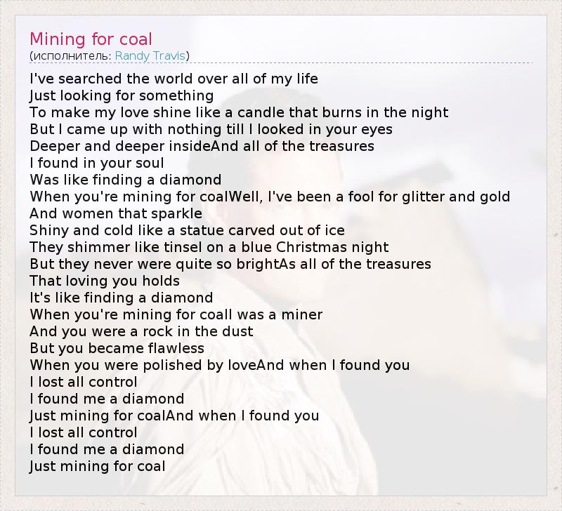 I've searched the world over all of my life Just looking for something To make my love shine like a candle that burns in the night But I came up with nothing till I looked in your eyes Deeper and deeper insideAnd all of the treasures I found in your soul Was like finding a diamond When you're mining for coalWell, I've been a fool for glitter and gold And women that sparkle Shiny and cold like a statue carved out of ice They shimmer like tinsel on a blue Christmas night But they never were quite so brightAs all of the treasures That loving you holds It's like finding a diamond When you're mining for coalI was a miner And you were a rock in the dust But you became flawless When you were polished by loveAnd when I found you I lost all control I found me a diamond Just mining for coalAnd when I found you I lost all control I found me a diamond Just mining for coal