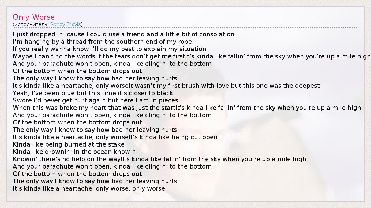 I just dropped in 'cause I could use a friend and a little bit of consolation I'm hanging by a thread from the southern end of my rope If you really wanna know I'll do my best to explain my situation Maybe I can find the words if the tears don't get me firstIt's kinda like fallin' from the sky when you're up a mile high And your parachute won't open, kinda like clingin' to the bottom Of the bottom when the bottom drops out The only way I know to say how bad her leaving hurts It's kinda like a heartache, only worseIt wasn't my first brush with love but this one was the deepest Yeah, I've been blue but this time it's closer to black Swore I'd never get hurt again but here I am in pieces When this was broke my heart that was just the startIt's kinda like fallin' from the sky when you're up a mile high And your parachute won't open, kinda like clingin' to the bottom Of the bottom when the bottom drops out The only way I know to say how bad her leaving hurts It's kinda like a heartache, only worseIt's kinda like being cut open Kinda like being burned at the stake Kinda like drownin' in the ocean knowin' Knowin' there's no help on the wayIt's kinda like fallin' from the sky when you're up a mile high And your parachute won't open, kinda like clingin' to the bottom Of the bottom when the bottom drops out The only way I know to say how bad her leaving hurts It's kinda like a heartache, only worse, only worse