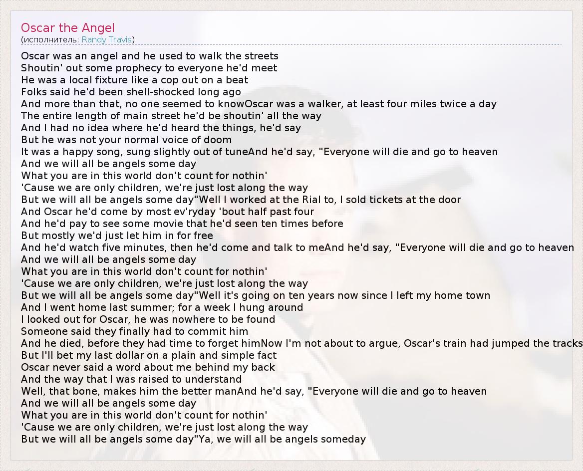 Oscar was an angel and he used to walk the streets Shoutin' out some prophecy to everyone he'd meet He was a local fixture like a cop out on a beat Folks said he'd been shell-shocked long ago And more than that, no one seemed to knowOscar was a walker, at least four miles twice a day The entire length of main street he'd be shoutin' all the way And I had no idea where he'd heard the things, he'd say But he was not your normal voice of doom It was a happy song, sung slightly out of tuneAnd he'd say, "Everyone will die and go to heaven And we will all be angels some day What you are in this world don't count for nothin' 'Cause we are only children, we're just lost along the way But we will all be angels some day"Well I worked at the Rial to, I sold tickets at the door And Oscar he'd come by most ev'ryday 'bout half past four And he'd pay to see some movie that he'd seen ten times before But mostly we'd just let him in for free And he'd watch five minutes, then he'd come and talk to meAnd he'd say, "Everyone will die and go to heaven And we will all be angels some day What you are in this world don't count for nothin' 'Cause we are only children, we're just lost along the way But we will all be angels some day"Well it's going on ten years now since I left my home town And I went home last summer; for a week I hung around I looked out for Oscar, he was nowhere to be found Someone said they finally had to commit him And he died, before they had time to forget himNow I'm not about to argue, Oscar's train had jumped the tracks But I'll bet my last dollar on a plain and simple fact Oscar never said a word about me behind my back And the way that I was raised to understand Well, that bone, makes him the better manAnd he'd say, "Everyone will die and go to heaven And we will all be angels some day What you are in this world don't count for nothin' 'Cause we are only children, we're just lost along the way But we will all be angels some day"Ya, we will all be angels someday