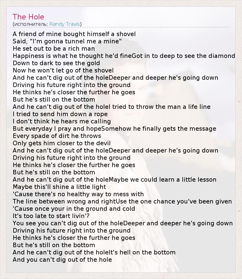 A friend of mine bought himself a shovel Said, "I'm gonna tunnel me a mine" He set out to be a rich man Happiness is what he thought he'd fineGot in to deep to see the diamond Down to dark to see the gold Now he won't let go of the shovel And he can't dig out of the holeDeeper and deeper he's going down Driving his future right into the ground He thinks he's closer the further he goes But he's still on the bottom And he can't dig out of the holeI tried to throw the man a life line I tried to send him down a rope I don't think he hears me calling But everyday I pray and hopeSomehow he finally gets the message Every spade of dirt he throws Only gets him closer to the devil And he can't dig out of the holeDeeper and deeper he's going down Driving his future right into the ground He thinks he's closer the further he goes But he's still on the bottom And he can't dig out of the holeMaybe we could learn a little lesson Maybe this'll shine a little light 'Cause there's no healthy way to mess with The line between wrong and rightUse the one chance you've been given 'Cause once your in the ground and cold It's too late to start livin'? You see you can't dig out of the holeDeeper and deeper he's going down Driving his future right into the ground He thinks he's closer the further he goes But he's still on the bottom And he can't dig out of the holeIt's hell on the bottom And you can't dig out of the hole