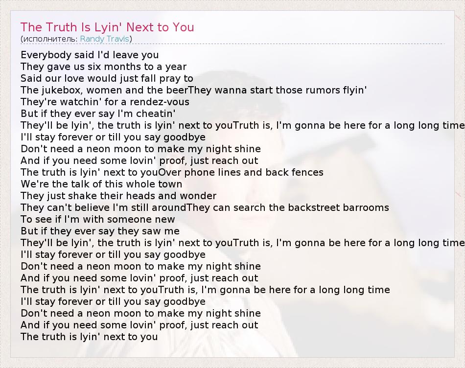Everybody said I'd leave you They gave us six months to a year Said our love would just fall pray to The jukebox, women and the beerThey wanna start those rumors flyin' They're watchin' for a rendez-vous But if they ever say I'm cheatin' They'll be lyin', the truth is lyin' next to youTruth is, I'm gonna be here for a long long time I'll stay forever or till you say goodbye Don't need a neon moon to make my night shine And if you need some lovin' proof, just reach out The truth is lyin' next to youOver phone lines and back fences We're the talk of this whole town They just shake their heads and wonder They can't believe I'm still aroundThey can search the backstreet barrooms To see if I'm with someone new But if they ever say they saw me They'll be lyin', the truth is lyin' next to youTruth is, I'm gonna be here for a long long time I'll stay forever or till you say goodbye Don't need a neon moon to make my night shine And if you need some lovin' proof, just reach out The truth is lyin' next to youTruth is, I'm gonna be here for a long long time I'll stay forever or till you say goodbye Don't need a neon moon to make my night shine And if you need some lovin' proof, just reach out The truth is lyin' next to you