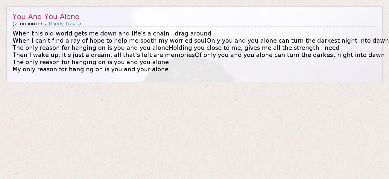 When this old world gets me down and life's a chain I drag around When I can't find a ray of hope to help me sooth my worried soulOnly you and you alone can turn the darkest night into dawn The only reason for hanging on is you and you aloneHolding you close to me, gives me all the strength I need Then I wake up, it's just a dream, all that's left are memoriesOf only you and you alone can turn the darkest night into dawn The only reason for hanging on is you and you alone My only reason for hanging on is you and your alone